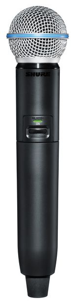 Shure GLXD24R+/Beta58 — беспроводная вокальная система с двойным диапазоном частот 2,4 ГГц и 5,8 ГГц, включающая передатчик GLXD2+ с микрофоном Beta58A и 9,5" рэковый приёмник GLXD4R+. Модель поддерживает до 8 одновременных систем (до 16 с Frequency Manager) и обеспечивает автоматическую настройку частоты. Beta58A — динамический вокальный микрофон с суперкардиоидной диаграммой направленности и частотным диапазоном 50–16 000 Гц. Система оснащена LC-дисплеем, индикацией заряда батареи в часах и минутах, интегрированным слотом для зарядки аккумулятора и литий-ионной батареей с временем работы до 12 часов. Радиус действия системы — до 60 метров. Выходы: XLR и 6,3 мм джек. Приёмник выполнен из пластика. В комплекте поставляются аккумулятор Shure, зарядное устройство и кейс EVA.