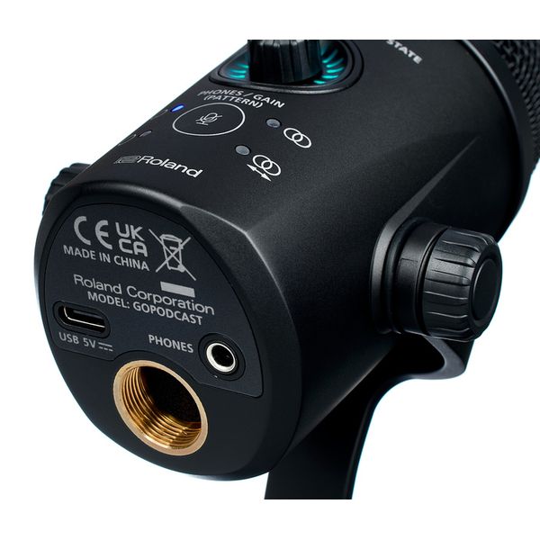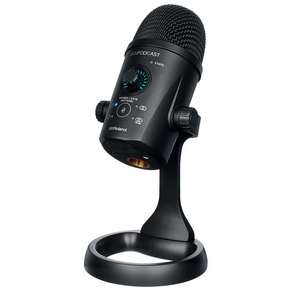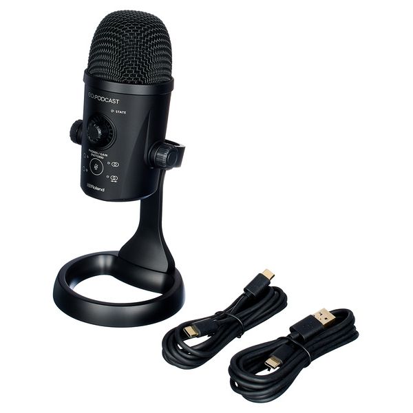 Roland GO:PODCAST — USB-конденсаторный микрофон для мобильного стриминга, выполняющий функции цифрового аудиоинтерфейса 24-бит/48 кГц и настольного микрофона с аппаратным мониторингом наушников. Конструкция включает капсюль с цифровым управлением диаграммой направленности, интегрированный АЦП, регулятор уровня громкости, индикаторы статуса уровня входного сигнала, громкости мониторинга в наушниках и Mute, стационарную настольную опору с механической стабилизацией корпуса. Микрофон подключается по USB-C напрямую к смартфону или компьютеру, обеспечивая запись речевых и музыкальных источников без внешних адаптеров. Приложение GO:PODCAST для iOS/Android предоставляет обработку видеосигнала, возможность одновременного использования нескольких камер мобильных устройств, наложение графики, работу с предустановленными макетами сцены и запись основного и независимых видеоканалов для пост-обработки. Устройство предназначено для подкастов, интервью, мобильных стримов, демонстраций и записи контента с минимальной конфигурацией периферии.
