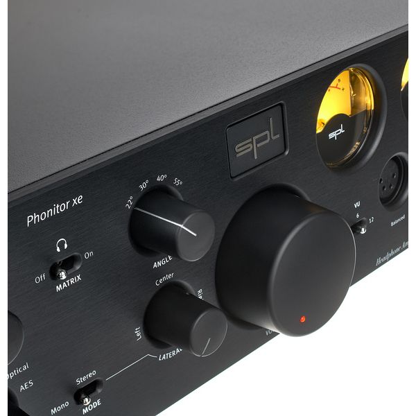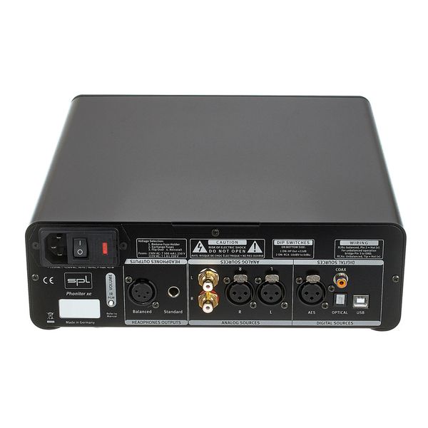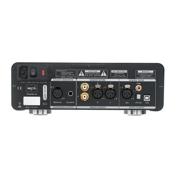 SPL Phonitor XE Black + DAC768v2 — мониторный усилитель для наушников с интегрированным цифро-аналоговым преобразователем DAC768v2, предназначенный для студийного контроля. Модель поддерживает подключение стандартных наушников через 6,3 мм TRS и балансных наушников с 4-контактным XLR. Устройство оснащено фирменной технологией VOLTAiR и матрицей Phonitor Matrix для имитации акустической сцены. Есть переключатель MODE для работы в моно или стерео, а также встроенный микрофон talkback. Частотный диапазон составляет 10 Гц – 300 кГц, динамический диапазон — 135,5 дБ (TRS) и 130,5 дБ (XLR), THD+N — 0,00082 %. Корпус выполнен в настольном формате, вес — 4,9 кг.