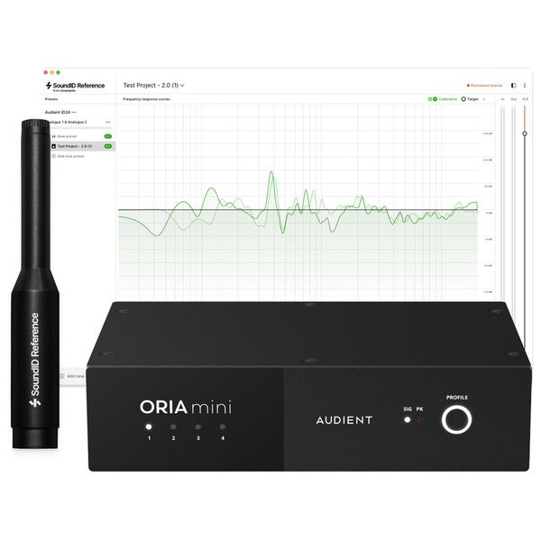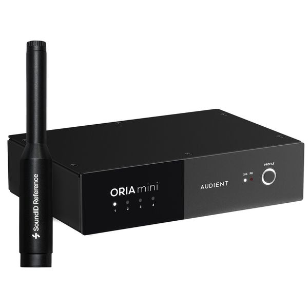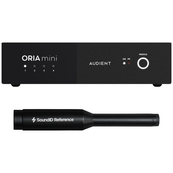 Audient ORIA Mini & SoundID Reference — аппаратная система профессиональной коррекции акустики помещения, представляющая собой компактное DSP‑устройство с интегрированной технологией Sonarworks SoundID Reference для измерения и калибровки звукового поля. Устройство предназначено для установки между аудиоинтерфейсом и студийными мониторами, обеспечивая точное воспроизведение без программных плагинов, с низкой задержкой и высокой стабильностью. Система поддерживает мониторинг в конфигурациях до 2.1, оснащена высокопроизводительными 32‑битными АЦ/ЦА‑преобразователями с динамическим диапазоном до 127 дБ. Комплектуется измерительным микрофоном и поставляется с полной лицензией SoundID Reference для создания и переноса профилей калибровки на саму аппаратную платформу ORIA Mini.