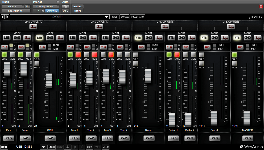 Wes Audio NGLeveler — 16-канальная система аналоговой автоматизации, предназначенная для точного управления уровнями сигнала в гибридных и полностью аналоговых студиях. Устройство сочетает интеграцию c DAW и поддержку HUI-контроллеров. Каждый из 16 каналов оборудован собственным аналоговым трактом с возможностью регулировки уровня, включения пассивного аттенюатора на −6 дБ и добавления аналогового насыщения через фирменную секцию THD. Благодаря высокому запасу по уровню (+25 dBu на входе и +28 dBu на выходе), устройство уверенно работает с сигналами любого уровня, сохраняя максимальную прозрачность и динамический диапазон. Коэффициент нелинейных искажений составляет менее 0.01%, что гарантирует чистоту звучания даже при активном насыщении. ngLeveler не имеет физических регуляторов, управление осуществляется через плагин WesAudio, HUI-контроллер или оба способа одновременно. Пользователь может осуществлять точную автоматизацию уровней в DAW, назначать имена каналам, группировать их, использовать Solo и Mute, а также активировать Trim-режим для тонкой подстройки уровня в пределах −10 дБ до +5 дБ. Trim-режим позволяет выполнять микро регулировку баланса, не нарушая существующей автоматизации в DAW, что особенно удобно при сведении больших сессий. Режим группировки каналов дает возможность объединять до четырёх групп с независимым управлением уровнями, насыщением и аттенюацией. Дополнительно реализованы режимы линковки каналов: Stereo (жесткая связь пары), Linked (связь с сохранением разницы уровней), Linked Opposite (инверсная связь каналов, когда повышение уровня одного вызывает снижение другого), а также Off (полный dual mono). Последний режим полезен при работе с моно-приборами и при тестировании поведения аналоговых цепей при изменении уровня входного сигнала. Каждый канал имеет отдельные индикаторы уровня до и после основного тракта (IN/OUT Metering), что позволяет визуально контролировать состояние сигнала на обоих участках цепи. THD может быть установлен в одно из трёх положений — Off, Medium или High, что позволяет варьировать степень гармонического насыщения от едва заметного до выраженного аналогового окрашивания. ngLeveler подходит для интеграции в аналоговую систему суммирования или цепь обработки внешним оборудованием. Устройство может быть установлено перед или после компрессоров, эквалайзеров и других внешних процессоров, обеспечивая автоматизацию уровня сигнала без нарушения их рабочих точек. Корпус устройства выполнен в 19-дюймовом формате с аналоговыми DB-25 разъёмами для 16 каналов и цифровыми портами USB и Ethernet для управления. ngLeveler полностью управляется цифровыми средствами, но весь звуковой тракт остаётся аналоговым и физически изолированным от управляющих цепей, что исключает влияние цифровых шумов на аудиосигнал.
