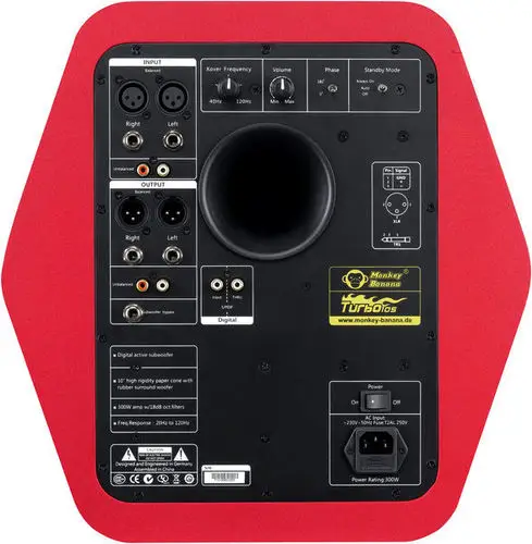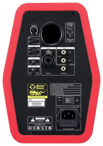 Monkey Banana Turbo 6 Red - стильный студийный монитор, оснащенный 6 1/2-дюймовым низкочастотным динамиком с полипропиленовой/керамической мембраной и 1-дюймовым высокочастотным динамиком, затянутым шелковой тканью.