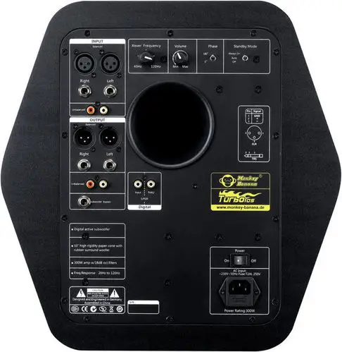 Коэффициент искажения составляет 0,08%, а сигнал НЧ - меньше 90 Дб. Частотный диапазон сабвуфера Monkey Banana Turbo 10s Red варьируется от 20 Гц - 40 Гц до 120 Гц. Частота диапазона может настраиваться самостоятельно в пределах 40 - 120 Гц. Сабвуфер оснащен нескольким входами и выходами для удобного процесса работы. Вы сами можете выбрать канал или вход.