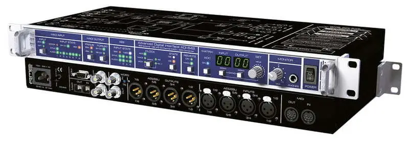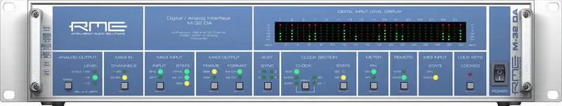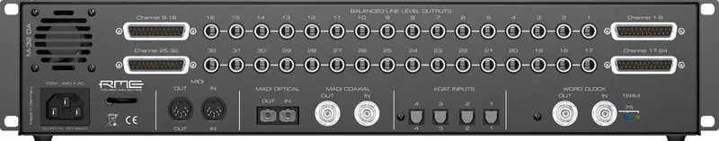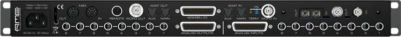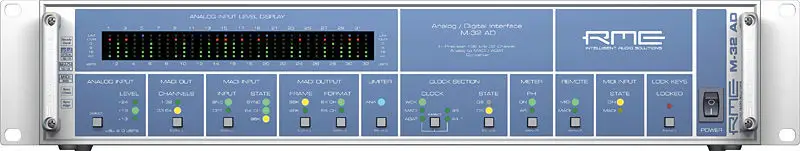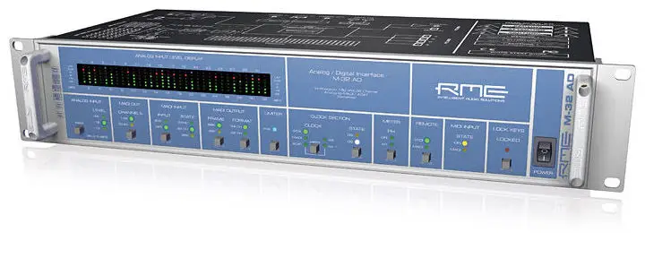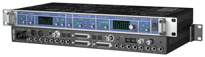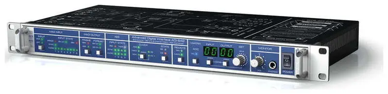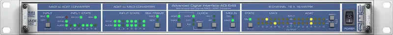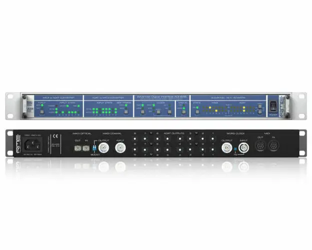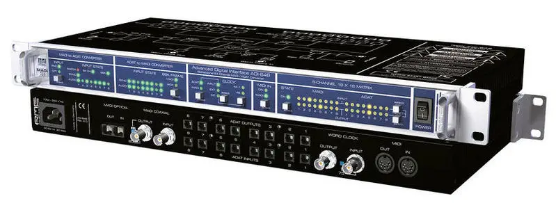RME ADI-6432 - это 64-канальный конвертор цифровых форматов. В RME ADI 6432 есть: Madi-вход: 1 BNC, 1 оптический; Madi-выход: 1 BNC, 1 оптический; AES / EBU-вход: 32/4-х на D-Sub разъем, трансформатор сбалансированный, SPDIF совместимый; AES / EBU-выход: 32/4-х на D-Sub разъем, трансформатор сбалансированный, 4 Vpp; MIDI вход и выход: два 5-контактных DIN-разъема; COM-порт: RS232 9-контактный D-Sub, 9600/19200/115200; Частоты дискретизации: 44,1 кГц, 48 кГц, 88,2 кГц, 96 кГц, 176,4 кГц, 192 кГц; Частотный диапазон: Madi: 32 - 192 кГц, Word Clock: 27 кГц - 200 кГц, AES: 28 кГц - 200 кГц. Габариты RME ADI-6432: 483/88/200 мм.