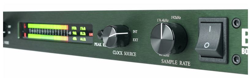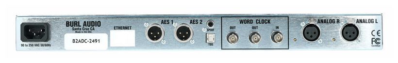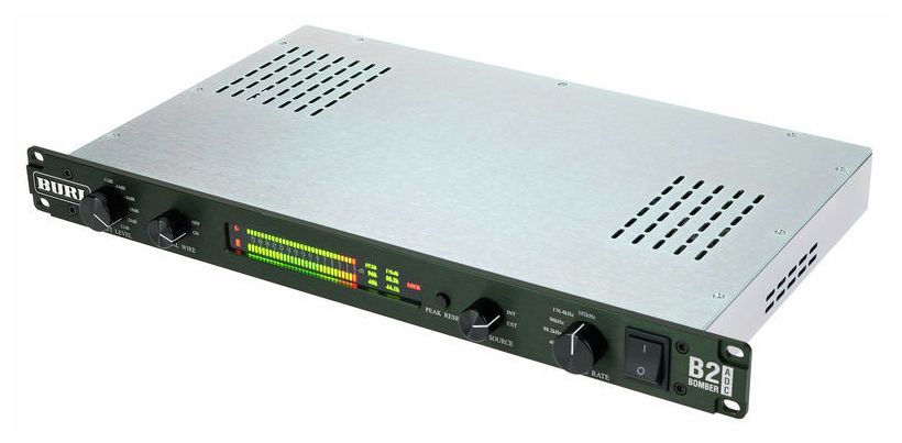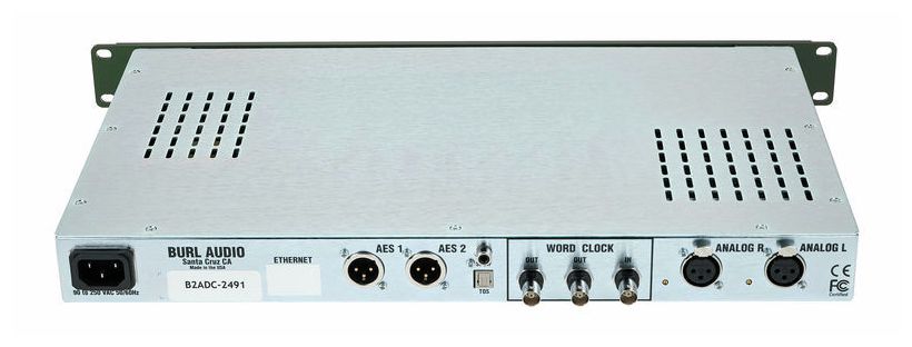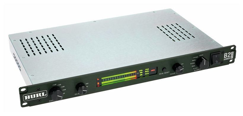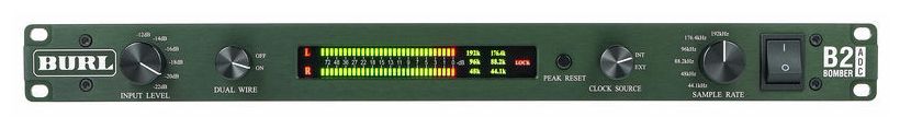 Burl Audio B2 Bomber ADC — двухканальный аналогово-цифровой преобразователь с разрешением 24 бит и частотой дискретизации 44,1–192 кГц, разработанный для студийной записи, микширования и мастеринга. Модель оснащена фирменным трансформаторным входным каскадом Burl BX1 и полностью дискретной аналоговой схемой Class-A без обратной связи и конденсаторов, что обеспечивает естественный, насыщенный аналоговый характер звука и высокое качество преобразования. B2 Bomber ADC оснащён 6-позиционным аттенюатором для управления уровнем входного сигнала, системой измерения с отображением пиков и RMS, двумя AES/EBU выходами, SPDIF и BNC входом для синхронизации с низким джиттером. Частотный диапазон при 48 кГц составляет 12–22 кГц, при 96 кГц — 15–46 кГц, при 192 кГц — 18–94 кГц с точностью ±0,1 дБ. Динамический диапазон достигает 120 дБ, а уровень искажений THD+N составляет до -100 дБ при +4 dBU и -94 дБ при +18 dBU. Корпус 19" 1U.