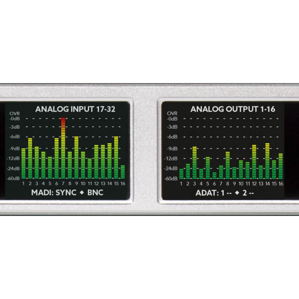 Ferrofish A32 Singlemode — 32-канальный AD/DA-конвертер, предназначенный для маршрутизации и преобразования аналоговых, MADI и ADAT-сигналов с частотой дискретизации до 192 кГц. A32 оснащён новейшими преобразователями Cirrus Logic. Все аналоговые входы и выходы выполнены на разъёмах D-Sub25 с независимой регулировкой уровня в диапазоне от −8 до +20 dBu с шагом 1 дБ. На цифровой стороне A32 оснащён полным комплектом интерфейсов MADI (оптика SC Singlemode и коаксиальный BNC), а также восемью портами ADAT (4 входа и 4 выхода) для передачи до 32 каналов при 48 кГц или 8 каналов при 192 кГц с использованием схемы S/MUX. MADI-интерфейсы поддерживают форматы 56 и 64 канала, автоматическую компенсацию задержек и резервирование портов. Все цифровые форматы синхронизируются внутренним клоком с точностью 50–100 пс и могут работать как в режиме приёма, так и генерации Word Clock по BNC. Для удобства управления предусмотрен MIDI I/O, поддержка MIDI-over-MADI и USB-подключение, позволяющее выполнять обновление прошивки и удалённое управление устройством. Четыре ярких TFT-дисплея обеспечивают полное отображение уровней 2 x 32 аналоговых каналов, матрицы маршрутизации, статуса синхронизации и конфигурации устройства. Встроенная система Smart Guide и контекстная справка позволяют работать с A32 без обращения к руководству. Внутренняя матрица маршрутизации обеспечивает свободное распределение и сплит всех 128 входов на 128 выходов блоками по 8 каналов, а также создание до семи стерео-сабмиксов с прослушиванием через фронтальный выход для наушников. Две DSP-секции, включая 400-МГц Sharc-DSP с 80-битным вычислительным ядром, обрабатывают все каналы с высокой точностью, сохраняя запас вычислительных ресурсов. Надёжность работы обеспечивают два внешних источника питания с функцией автоматического переключения.