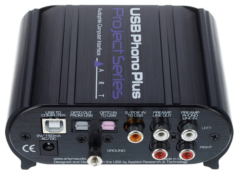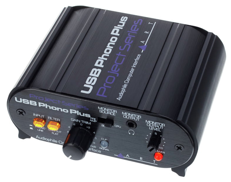 ART USB Phono Plus — компактный фонокорректор и аудиоинтерфейс, предназначенный для оцифровки и записи виниловых пластинок. Устройство объединяет фирменный phono-предусилитель с низким уровнем шума и расширенные цифровые возможности, включая встроенный USB-интерфейс, коаксиальные и оптические разъёмы S/PDIF. Модель оснащена стереовходами RCA с переключением режима Phono/Line, что позволяет подключать как проигрыватели винила, так и линейные источники. В тракте предусмотрен фильтр низких частот (Low Cut), устраняющий инфранизкие резонансы и механические шумы пластинки. На выходе доступны стереопары RCA и оптический цифровой выход, а также отдельный выход для наушников 3,5 мм с независимой регулировкой уровня и возможностью аппаратного мониторинга без задержки. Дополнительно предусмотрены оптический и коаксиальный S/PDIF-входы, что позволяет использовать устройство как универсальный USB-конвертер между аналоговыми и цифровыми источниками. Встроенный интерфейс USB класса Class Compliant обеспечивает работу без драйверов с системами macOS и Windows, позволяя записывать аудио с разрешением 16 бит при частоте дискретизации 44,1 или 48 кГц. Питание осуществляется от шины USB или внешнего адаптера постоянного/переменного тока (7–12 В). Корпус выполнен из алюминия с интегрированными резиновыми вставками для устойчивости на поверхности.