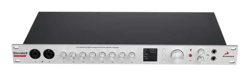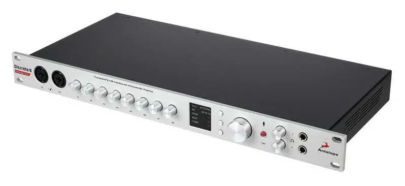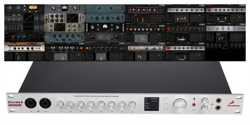 Antelope Audio Discrete 8 Pro Synergy Core – рэковый аудиоинтерфейс 26 x 32 с подключением Thunderbolt 3 и USB 2.0, предусилителями профессионального уровня, ядром Antelope Discrete 8 Pro Synergy Core и широкими возможностями подключения. Размер в рэке — 1U. Встроено 37 эффектов, эмулирующих аналоговое оборудование. Эффекты обрабатываютсясо срерхнизкой задержкой встроенными микросхемами DSP и FPGA. Эффекты могут быть загружены на шестнадцать каналов. Интерфейс позволяет эмулировать популярные студийные модели микрофонов при совместном использовании с микрофонами серии Edge.