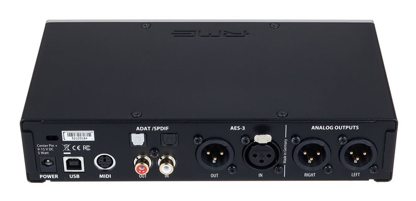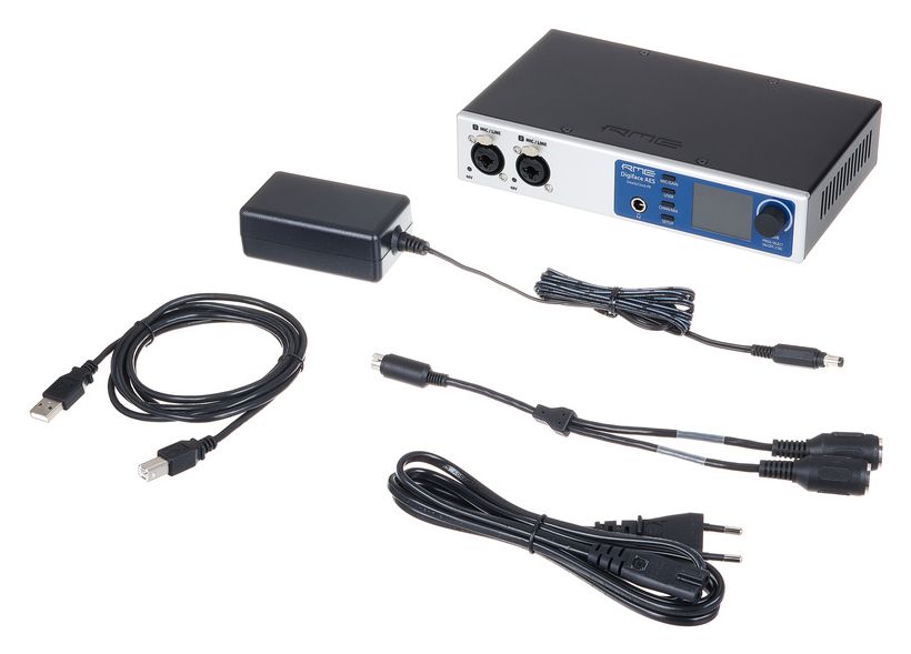 RME Digiface AES — USB 2.0 аудиоинтерфейс с 14 входами и 16 выходами, объединяющий аналоговые и цифровые форматы в одном корпусе. Устройство питается напрямую от шины USB, при этом предусмотрена возможность подачи внешнего питания через разъём USB-C, если ток USB-порта недостаточен. Интерфейс оснащён двумя комбинированными входами Mic/Line (XLR/TRS) с предусилителями, аналогичными тем, что используются в Babyface Pro FS — с диапазоном усиления до 75 дБ и индивидуальным фантомным питанием +48 В. На выходе предусмотрены два балансных линейных XLR и отдельный стереовыход для наушников (TRS). Цифровая часть включает интерфейсы AES/EBU, S/PDIF (коаксиальный и оптический) и ADAT, которые могут использоваться одновременно. Встроенный DSP с системой TotalMix FX обеспечивает маршрутизацию, мониторинг и обработку сигнала, включая параметрический эквалайзер и реверберацию. Система синхронизации SteadyClock FS гарантирует минимальный уровень джиттера и стабильную работу при любых источниках тактирования. Digiface AES подходит для профессионального применения в студиях, мобильных сетапах и инсталляциях, где требуется компактное решение с точной цифровой синхронизацией и высококачественными предусилителями.