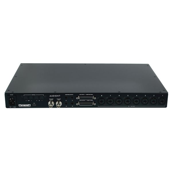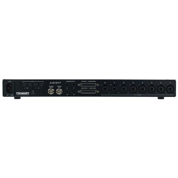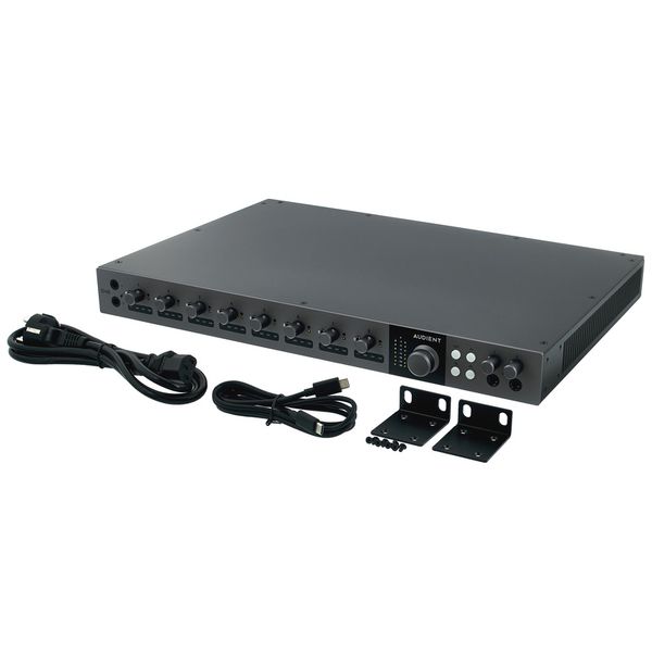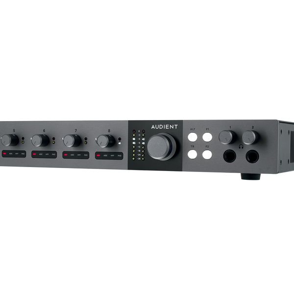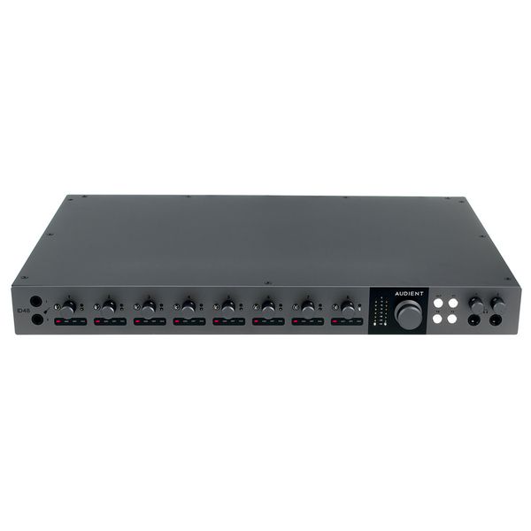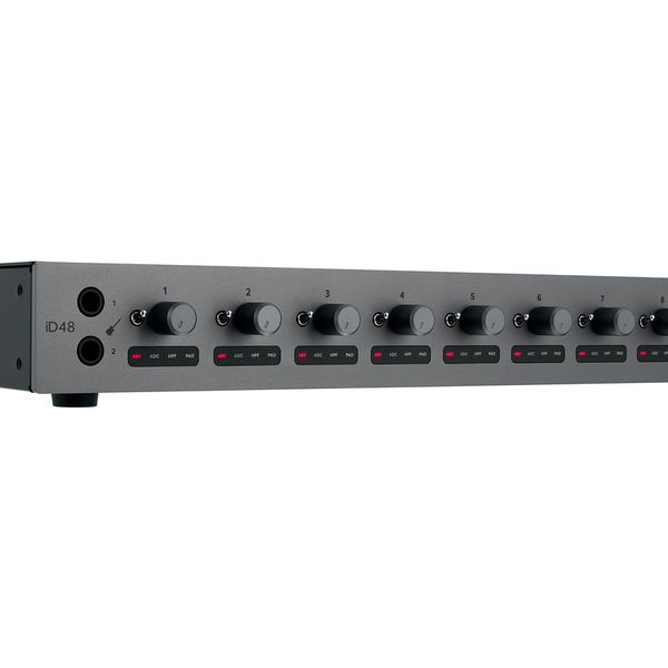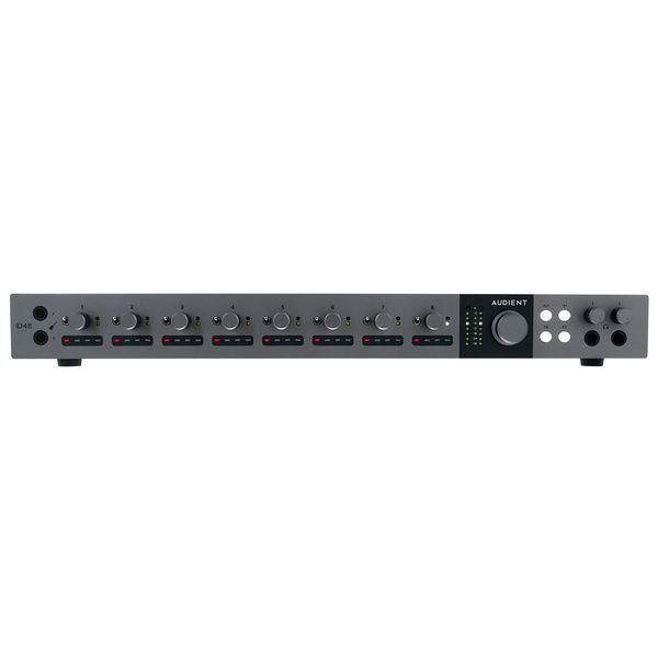 Audient iD48 — 1U USB‑интерфейс с 24 аналоговыми входами и 32 выходами (24 одновременно). Оснащён восемью Class‑A микрофонными предусилителями с 68 дБ гейна и низким уровнем шума, плюс двумя JFET инструментальными входами на передней панели.Имеются восемь переключаемых балансных insert‑каналов для внешней обработки аналогом до и после АЦП. Интерфейс поддерживает ADAT‑расширение (2 входа/выхода), Word Clock I/O и USB‑C, с динамическими диапазонами 126,5 дБ (DAC) и 120 дБ (ADC). Встроенный DSP‑микшер iD Mixer позволяет создавать до четырех cue‑миксов, использовать функцию loopback, управлять мониторами и talkback, назначать F‑кнопки.