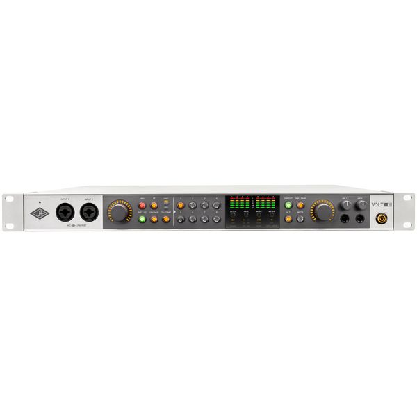 Universal Audio Volt 876 USB Recording Studio — аудиоинтерфейс с восемью аналоговыми предусилителями и компрессорами. Модель разработана для профессиональных студий звукозаписи и обеспечивает характерное тёплое аналоговое звучание благодаря встроенным схемам Vintage Mic Preamp (на основе лампового предусилителя UA 610) и компрессорам 76 Compressor, вдохновлённым классическим лимитером 1176. Volt 876 поддерживает запись с частотой до 192 кГц и 32-битной точностью, предлагая прозрачное преобразование и динамический диапазон, сравнимый с системами класса Apollo. Устройство выполнено в прочном металлическом корпусе формата 19" / 1U и может использоваться как настольное или рэковое решение (кронштейны входят в комплект). Каждый из восьми входных каналов Volt 876 оснащён комбинированным разъёмом XLR/TRS и индивидуальным управлением усилением, фантомным питанием (+48 В) и компрессором. Два передних канала дополнительно работают в инструментальном режиме (Hi-Z) для прямого подключения гитар и синтезаторов. Реализована цифровая автоматическая регулировка усиления (Assistive Auto-Gain) с полной функцией восстановления сессии через приложение UAD Console. Интерфейс поддерживает автономный режим ADAT для расширения аналоговых входов и выходов, а также возможность объединения до трёх устройств Volt 876 в одну систему (24 x 28). Для общения в студии предусмотрен встроенный микрофон talkback и два независимых стереовыхода для наушников. Volt 876 подходит для работы с DAW LUNA и поддерживает все популярные программы на macOS, Windows, iPad и iPhone. Режим прямого мониторинга в реальном времени позволяет управлять балансом входных и воспроизводимых сигналов без ощутимой задержки. На борту предусмотрены восемь линейных выходов, включая две пары мониторных и альтернативных, а также оптические порты ADAT (вход/выход), MIDI In/Out и синхронизация по BNC. Комплектное программное обеспечение включает DAW LUNA и пакет плагинов UAD Producer Suite, а также сторонние инструменты от Ableton, Softube, UJAM, Celemony и Spitfire Audio.
