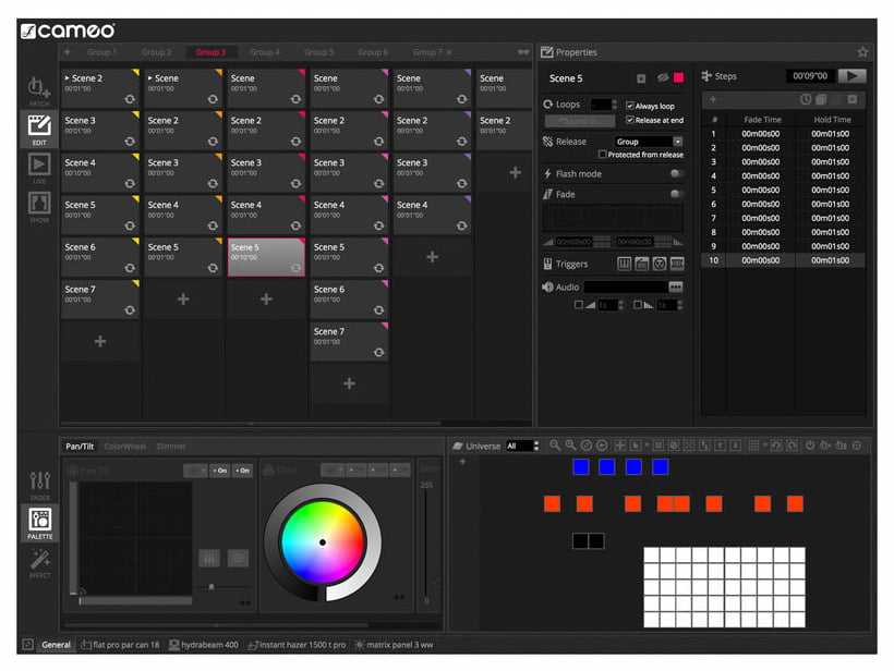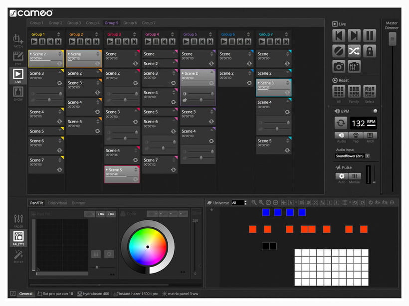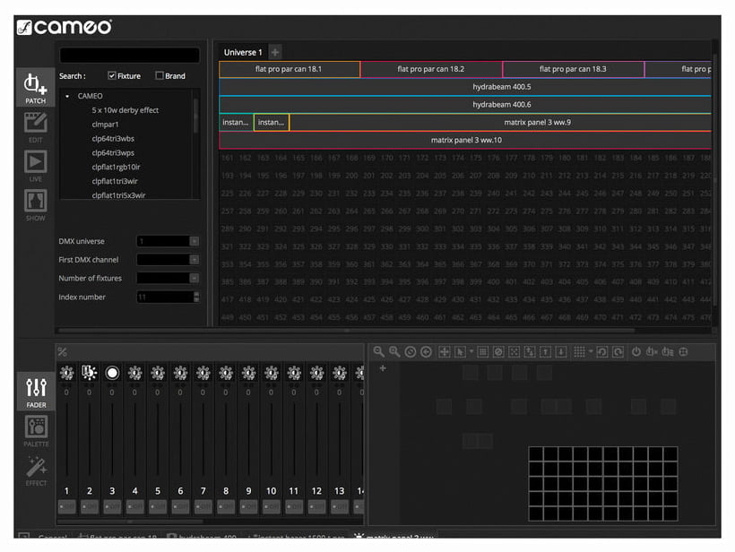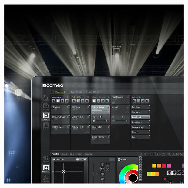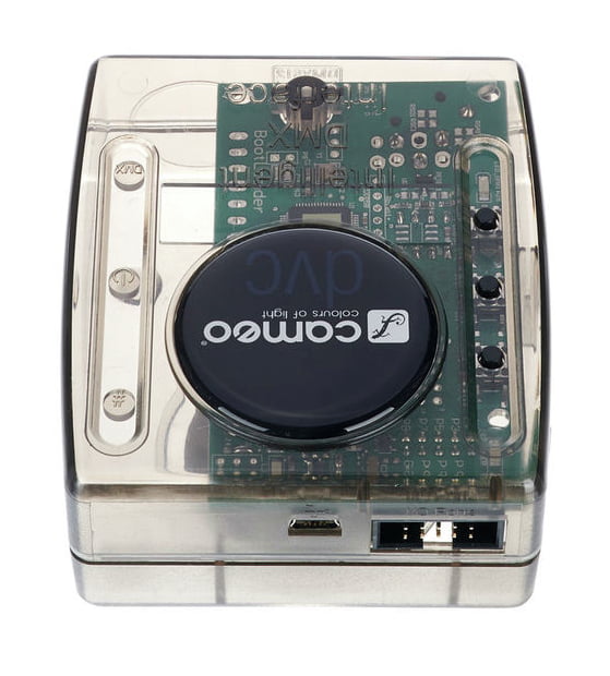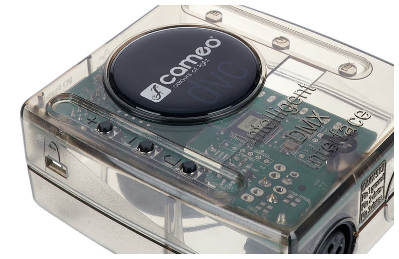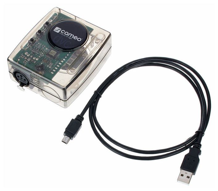 Cameo DVC DMX-Interface & Software — DMX-интерфейс с программным обеспечением для управления совместимыми DMX-световыми приборами через ПК или Mac. Модель обеспечивает работу с 512 DMX-каналами в реальном времени и позволяет использовать встроенную флеш-память для автономного воспроизведения заранее запрограммированных световых шоу с 256 каналами. В комплект входит программное обеспечение с библиотекой из 15 000 устройств и редактор ScanLibrary для создания и редактирования пользовательских профилей приборов. Программа позволяет выбирать отдельные типы DMX-устройств, группировать их и добавлять в световое шоу на 2D-панели, создавать динамические сцены, накладывать эффекты, обеспечивает управление без использования фейдеров. Встроенный XEEL-движок генерирует сотни разнообразных эффектов, доступна визуализация в 3D в реальном времени. Интерфейс поддерживает live-редактирование, аудиоанализ и синхронизацию с MIDI-клоком. Экранное оформление можно полностью настроить под индивидуальные потребности, а бесплатное приложение Easy Remote позволяет управлять девайсом через iPhone, iPad или Android по WiFi.