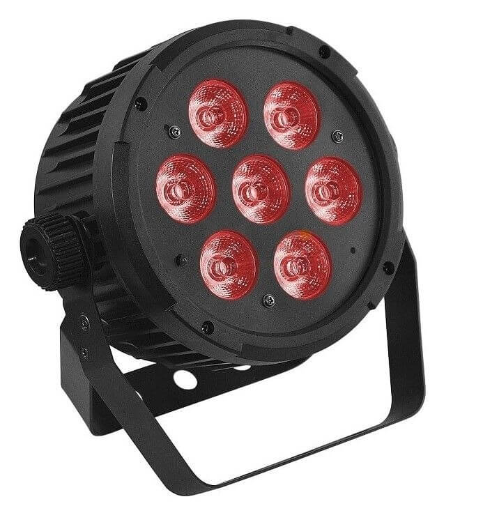 PROCBET PAR LED 7-15 RGBWA+UV PL — светодиодный сценический прожектор формата PAR. Оснащён семью мультичип-светодиодами по 15 Вт, каждый из которых объединяет шесть цветов (RGBWA+UV: красный, зелёный, синий, белый, янтарный …