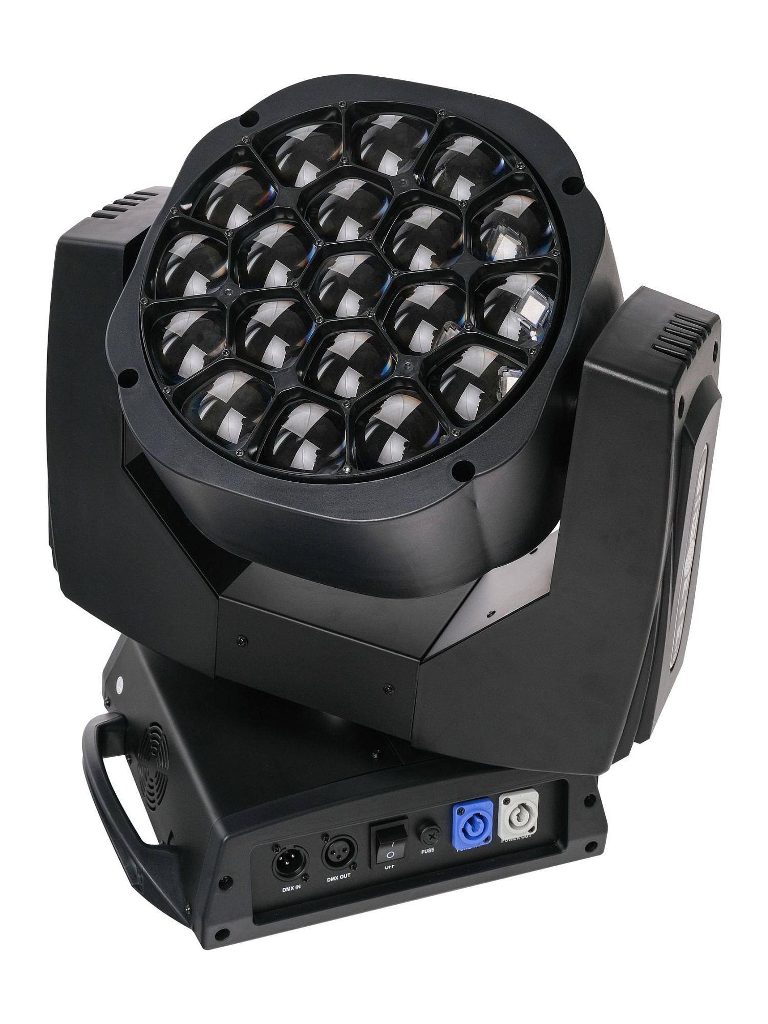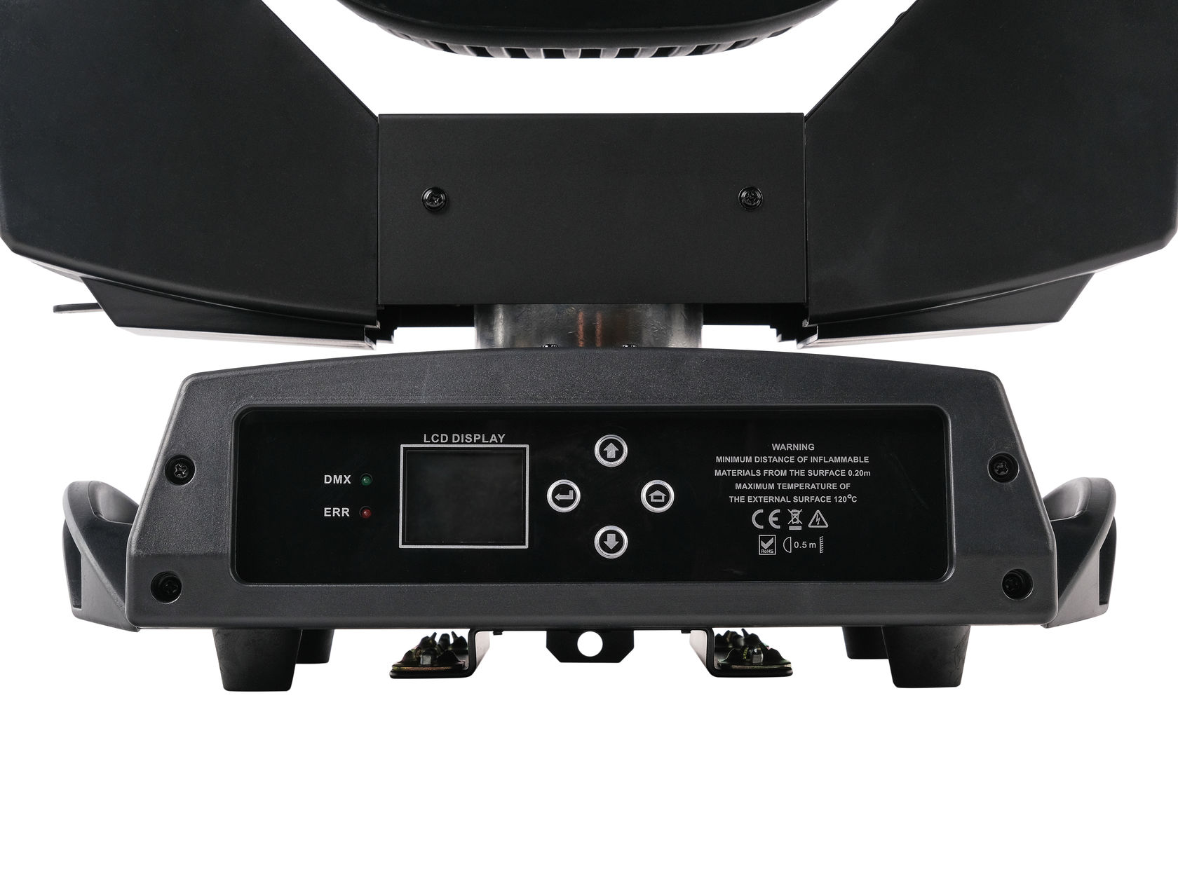 LFocus MH-4 — вращающаяся световая голова, предназначенная для концертных и клубных инсталляций, проката. В качестве источника света используется массив из 19 светодиодов CREE RGBW по 15 Вт, интегрированный в оптическую систему с асферической линзой, световодом и бесшовной склейкой, обеспечивающей чистый луч и высокую однородность цветопередачи. Зум 3.8–35° позволяет формировать как узкий пучок, так и широкую заливку. Механическая часть основана на точных шаговых моторах, обеспечивающих панораму 540°, наклон 270° и бесконечное вращение по оси Z для динамических эффектов. Корпус выполнен из огнестойкого и термостойкого инженерного пластика с металлическим напылением, устойчивого к температурным нагрузкам в условиях интенсивной эксплуатации. Прибор поддерживает DMX, Master/Slave, Auto и Sound-режимы, предлагая широкий выбор каналов и встроенные цифровые эффекты.