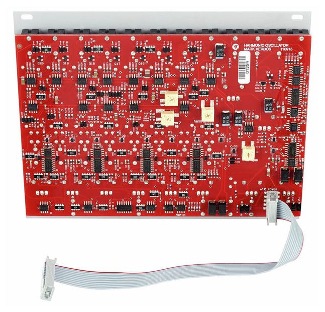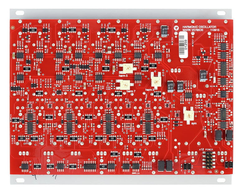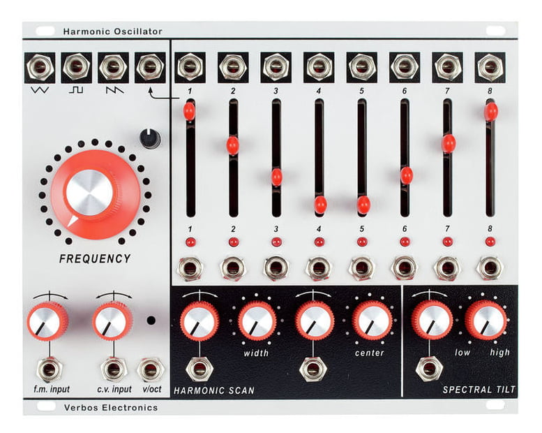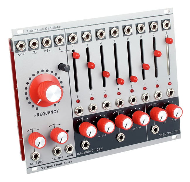 Verbos Electronics Harmonic Oscillator — аналоговый осциллятор с контролем гармоник для модульных систем. Основан на дискретной транзисторной схеме, имеет отдельные выходы для первых восьми гармоник в виде синусоидальных волн, а также стандартные формы сигнала — треугольную, пилообразную и квадратную. Каждая гармоника имеет отдельный CV-вход для управления уровнем через внешнее напряжение, при этом фактический уровень регулируется с помощью слайдера в микшере на панели. Встроенный voltage controlled микшер с параметрами Width, Center и Tilt позволяет менять баланс гармоник и смешивать их через панельные регуляторы или CV-входы, каждый параметр снабжён аттенюатором. Осциллятор поддерживает линейную и экспоненциальную частотную модуляцию, каждый вход также снабжён аттенюатором. Есть откалиброванный 1V/Oct для модуляции высоты тона. Светодиодная индикация отображает активность каналов микшера, что облегчает работу при патчинге. Частотный диапазон генерации — от 3 Гц до 20 кГц.