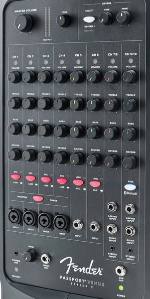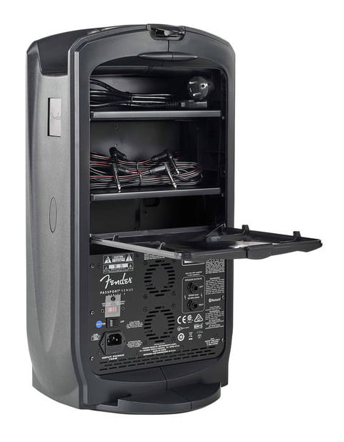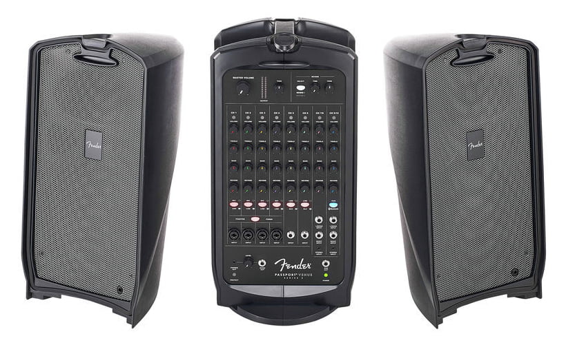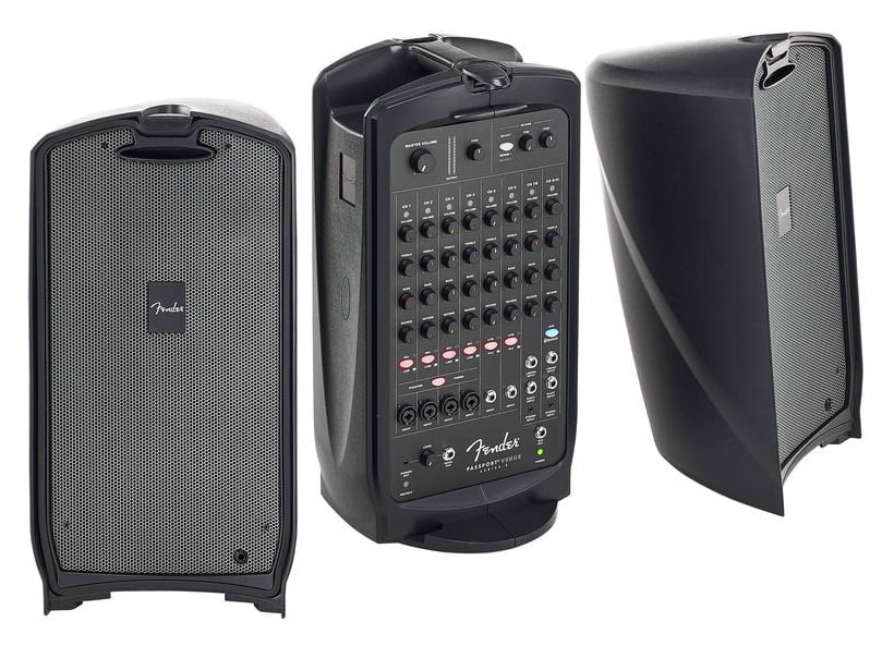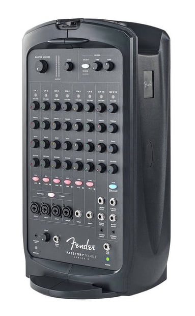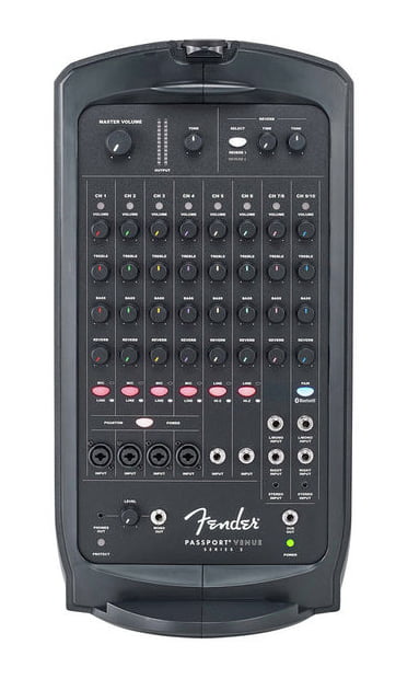 Fender Passport Venue Series 2 — портативная акустическая система, объединяющая микшер и усилитель в компактном корпусе с парой широкополосных акустических колонок. Система обеспечивает выходную мощность в 600 Вт. В комплекте 10-канальный активный микшер с Bluetooth-подключением, позволяющим воспроизводить аудио с мобильных устройств. Четыре комбинированных входа XLR/TRS подходят для микрофонов и линейных источников, два входа Hi-Z поддерживают подключение инструментов, также есть входы (стерео) 6,3 и 3,5 мм. Каждый канал оснащён отдельными регуляторами громкости, тембра и реверберации. Имеются фантомное питание для конденсаторных микрофонов, выход для сабвуфера с автоматическим фильтром ВЧ и три линейных выхода для расширенных конфигураций. Корпус выполнен из прочного пластика с ручкой для транспортировки. Вся система собирается в чемодан для транспортировки, кабели фиксируются внутри кейса.