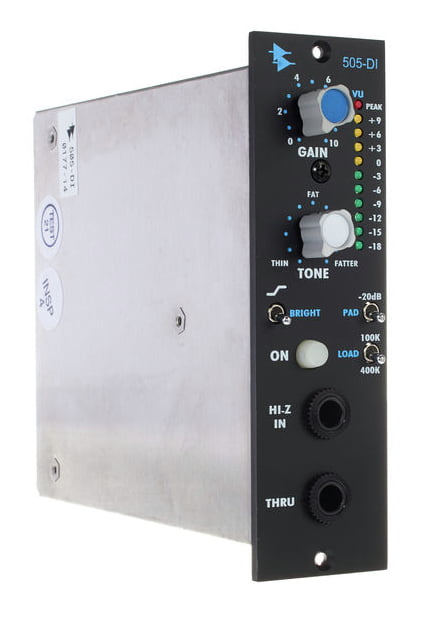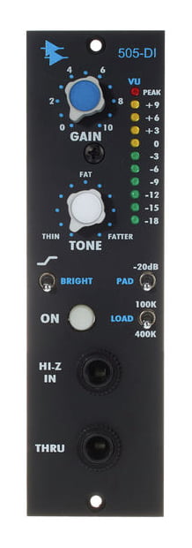 API Audio 505-DI — DI-модуль формата 500 Series, предназначенный для прямого подключения гитар, бас-гитар, клавишных инструментов и линейных источников к студийному тракту без использования внешних ди-боксов. Устройство разработано на основе консольного модуля API 205L и использует полностью дискретную схемотехнику с фирменными операционными усилителями API 2520 и 2510, обеспечивая высокий запас по уровню, минимальные искажения и характерное плотное, артикулированное звучание API. 505-DI оптимизирован для работы с высокоомными инструментальными звукоснимателями и минимизирует нагрузку на Hi-Z источники, сохраняя их частотный баланс и динамику. Широкий диапазон усиления позволяет нормализовать уровень сигнала от микрофонного и инструментального до полноценного линейного уровня, пригодного для записи или дальнейшей обработки. Встроенный пассивный двухполосный тон-контур с фиксированными частотами позволяет корректировать низкие частоты и добавлять разборчивость в верхнем диапазоне без применения внешнего эквалайзера. Переключаемая входная нагрузка позволяет тонко управлять взаимодействием модуля с пассивными звукоснимателями, изменяя характер атаки и высокочастотного отклика. Для работы с активными инструментами, сэмплерами и клавишными предусмотрен аттенюатор, снижающий уровень входного сигнала без ухудшения импедансного согласования. Наличие сквозного выхода (Thru) делает модуль удобным для одновременной записи чистого сигнала и подачи его на усилитель или сценический тракт. Встроенная светодиодная индикация обеспечивает точный контроль уровня.