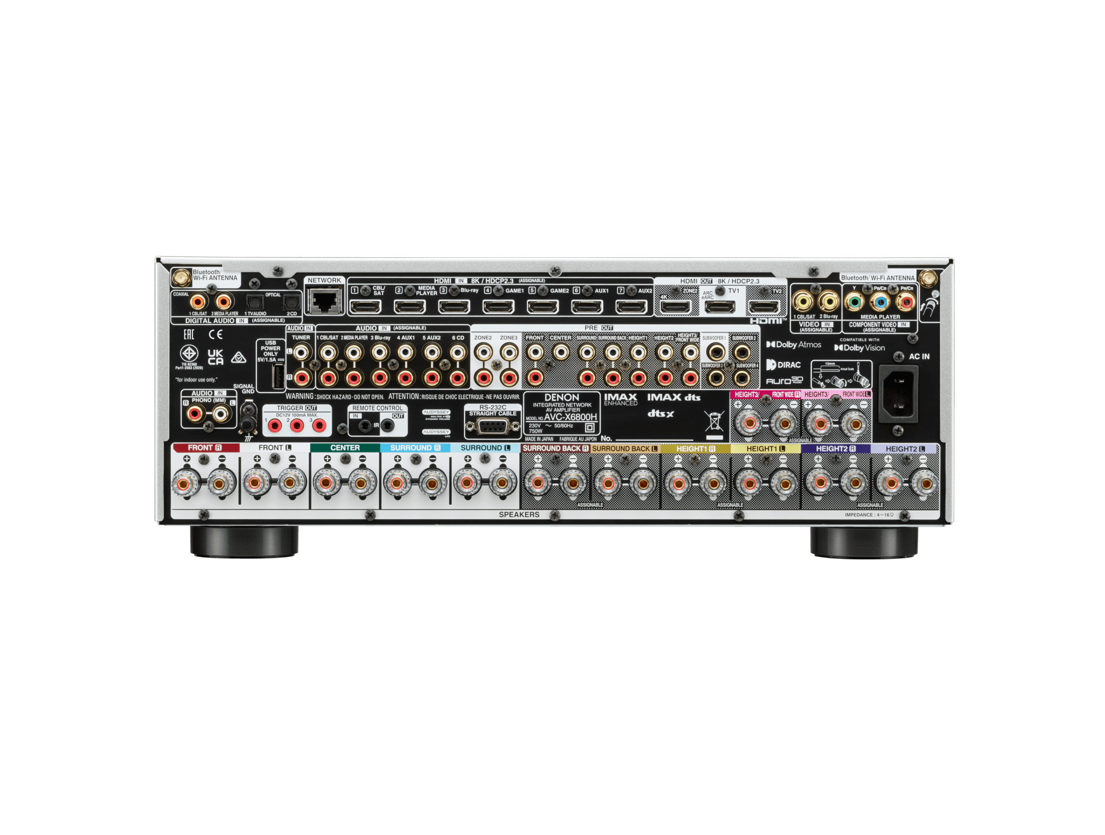 Denon AVC-X6800H Silver — AV‑усилитель для домашних кинотеатров с поддержкой 11.4 каналов усиления и передовой цифровой схемотехникой. Устройство оснащено 11 дискретными усилительными каналами (с возможностью обработки до 13.4 каналов) и способно выдавать порядка 140 Вт на канал при нагрузке 8 Ом (THD 0,05 %, 20 Гц-20 кГц, 2 канала). Аппарат поддерживает объемный звук в форматах Dolby Atmos, DTS:X, Auro‑3D и IMAX Enhanced, а также обеспечивает видео-проходку и апскейлинг до 8K через восемь HDMI-входов и три выхода, включая eARC. Интегрированная платформа HEOS позволяет организовать многозонное беспроводное аудио с поддержкой потоковых сервисов и голосового управления. Корпус устройства металлический, с усиленным шасси и системой охлаждения, рассчитанной на стабильную работу под нагрузкой в крупных аудио-/видео инсталляциях.
