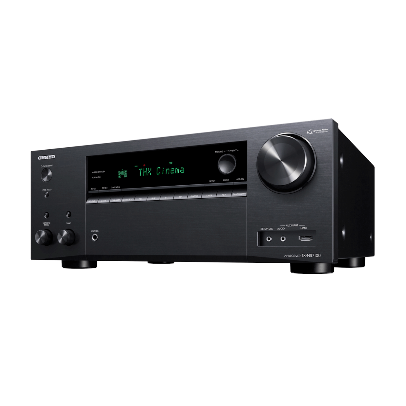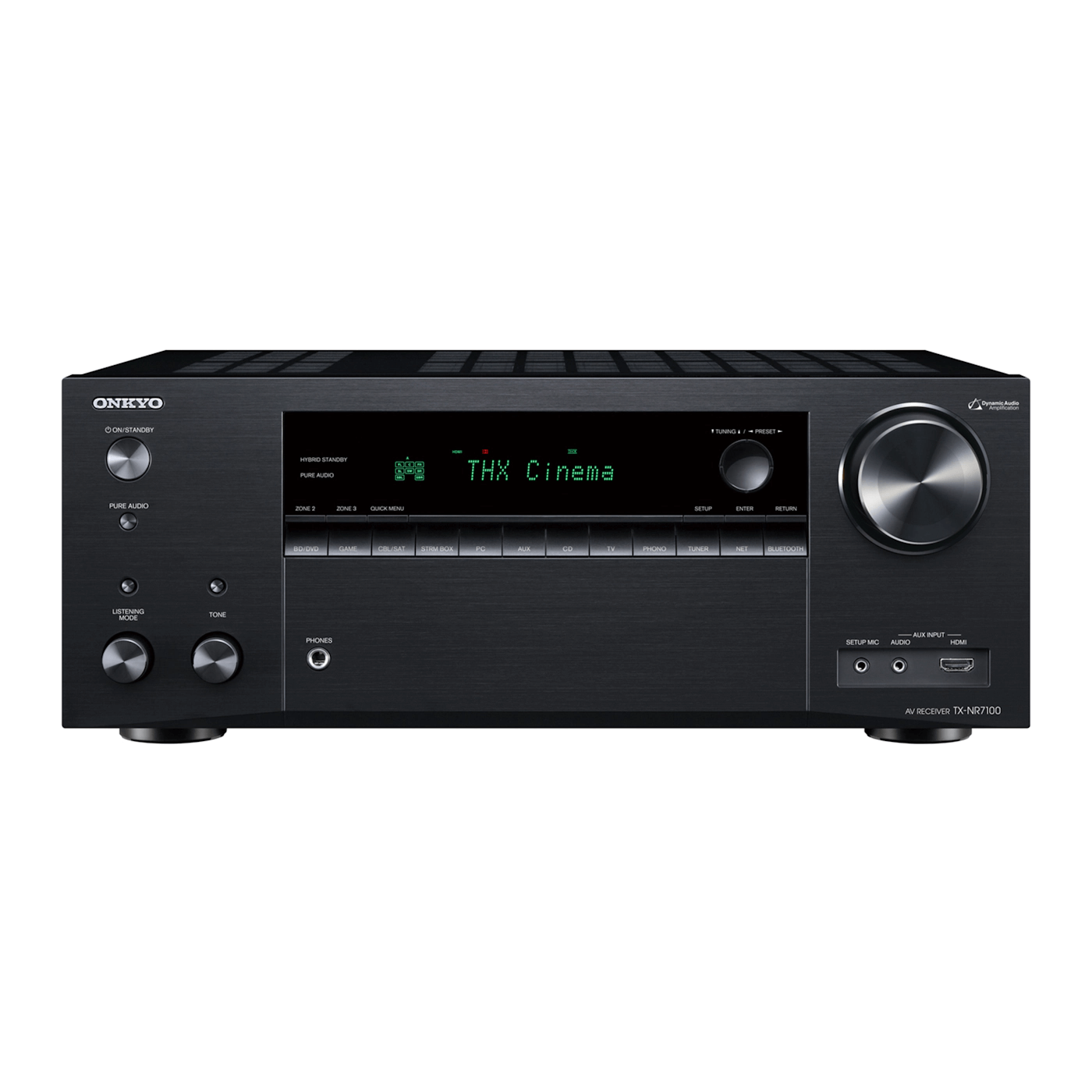 Onkyo TX-NR7100 M2 Black — 9.2-канальный AV-ресивер для домашних кинотеатров. Модель сочетает в себе высокую выходную мощность 185 Вт на канал, широкие возможности подключения и калибровки, поддержку форматов Dolby Atmos и DTS:X, а также систему автоматической коррекции акустики помещения Dirac Live. Аппарат построен на дискретной аналоговой архитектуре усиления (Dynamic Audio Amplification, DAA) с улучшенной схемотехникой заземления и оптимизированной топологией питания, что обеспечивает высокий запас по динамике и низкий уровень нелинейных искажений (0,08%). Ресивер сертифицирован по стандартам IMAX Enhanced и THX Certified Selectб, что предусматривает прохождение более 2000 тестов в 75 категориях — от искажений и мощности до теплового поведения и стабильности усиления. Все HDMI-входы и выходы поддерживают HDMI 2.1 с пропусканием сигнала 8K/60p и 4K/120p, а также технологии HDR10+, Dolby Vision, HLG, Dynamic HDR, и защиту контента HDCP 2.3. Поддерживаются игровые функции VRR (Variable Refresh Rate), ALLM (Auto Low Latency Mode) и QFT (Quick Frame Transport), что делает устройство подходящим не только для кино, но и для игровых систем. Для точной адаптации звука к особенностям помещения предусмотрена система Dirac Live с измерительным микрофоном, которая выполняет фазовую и амплитудную коррекцию в реальном времени. Режим AccuReflex обеспечивает согласование фазовых характеристик потолочных каналов Atmos, улучшая пространственную локализацию источников звука. Аппарат оснащён многофункциональной потоковой платформой SMART AV Receiver, включающей Chromecast built-in, AirPlay 2, DTS Play-Fi, Spotify Connect, TIDAL, Deezer, Amazon Music HD и TuneIn. Есть совместимость с системами Sonos, Alexa, Google Assistant и OK Google. Для интеграции в многокомнатные системы предусмотрено управление через приложение Onkyo Controller, поддержка Zone 2/Zone 3 с отдельным ЦАП, а также возможность независимого воспроизведения сигнала в трех зонах. Сетевое подключение реализовано через двухдиапазонный Wi-Fi (2,4/5 ГГц) с поддержкой стандарта 802.11ac (2 х 2 MIMO) и проводное Ethernet-подключение. Кроме того, ресивер поддерживает двустороннюю Bluetooth-передачу с кодеками SBC, AAC, aptX, aptX HD, что позволяет использовать беспроводные наушники или колонку как приемник. Среди дополнительных функций — Vocal Enhancer для повышения разборчивости речи, Stereo Assign для фонового воспроизведения, триггерный выход 12 В, ИК-вход, RS-232C и Ethernet для систем автоматизации, а также eARC и HDMI Sub/Zone 2 для подключения второго дисплея.