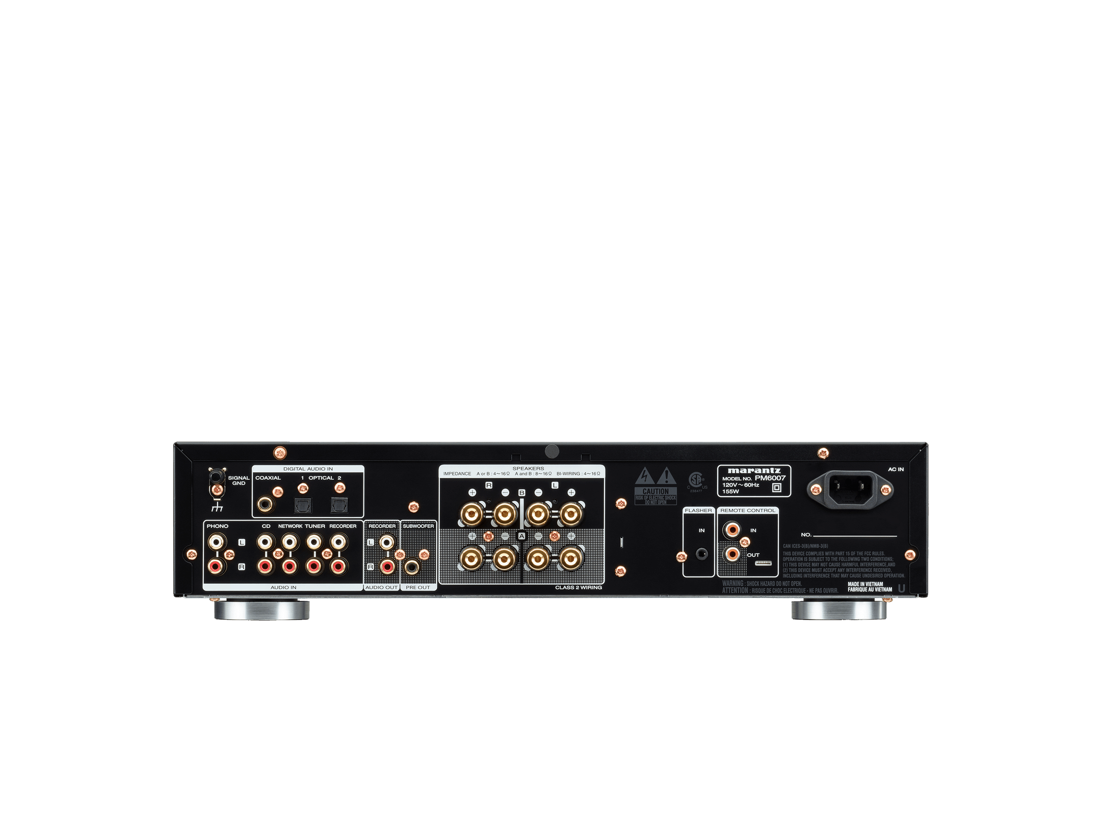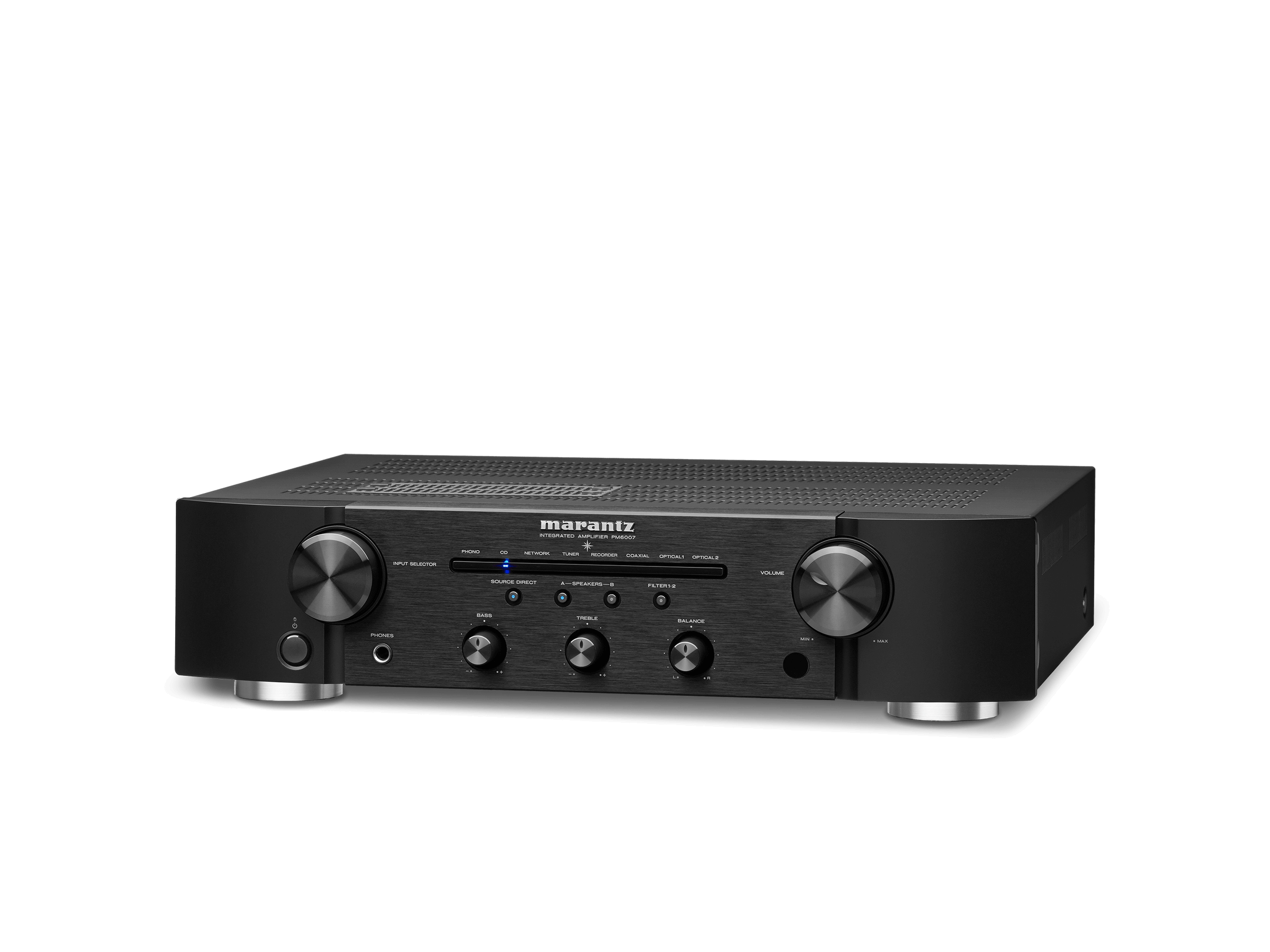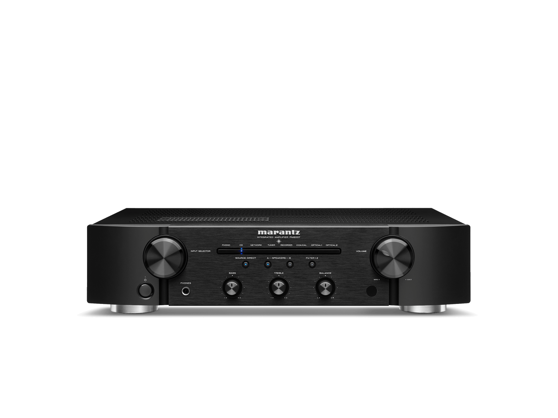 Marantz PM6007 Black — интегрированный усилитель. Конструкция базируется на фирменной архитектуре усиления с обратной токовой связью (Current Feedback) и использует дискретные каскады на модулях HDAM-SA3 и HDAM-SA2 (Hyper Dynamic Amplifier Module). Модули обеспечивают повышенную скорость нарастания сигнала, низкий уровень искажений и точную фазовую согласованность каналов. В основе силовой схемы лежит тороидальный трансформатор с низким уровнем механических вибраций и высоким КПД. Усилитель развивает мощность 2 х 45 Вт при нагрузке 8 Ом и 2 х 60 Вт при 4 Ом. Аналоговая часть дополнена цифровым блоком с интегрированным ЦАП AK4490, поддерживающим обработку потоков PCM с частотой дискретизации до 192 кГц и разрядностью 24 бит. Для цифровых источников предусмотрены два оптических и один коаксиальный вход, все с позолоченными контактами. Аналоговых входов — пять, включая один для проигрывателя винила с MM-картриджем, оснащенный малошумным фонокорректором стандартного типа. Предусмотрены линейный выход на сабвуфер и выход на наушники с выделенным усилительным каскадом. Особое внимание уделено акустическим клеммам: используются металлические, позолоченные винтовые терминалы типа “A/B”, допускающие подключение двух пар колонок. В схеме управления реализована функция Source Direct для обхода эквалайзера (высокие и низкие). В комплекте идет пульт дистанционного управления.