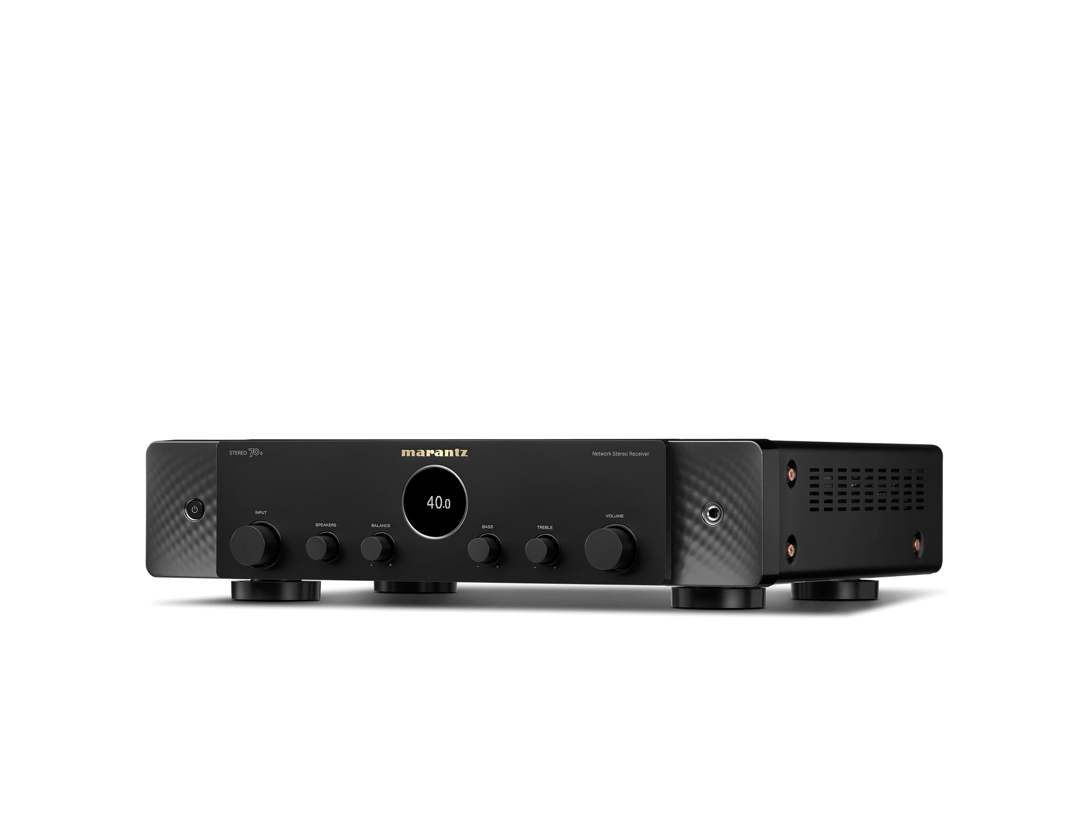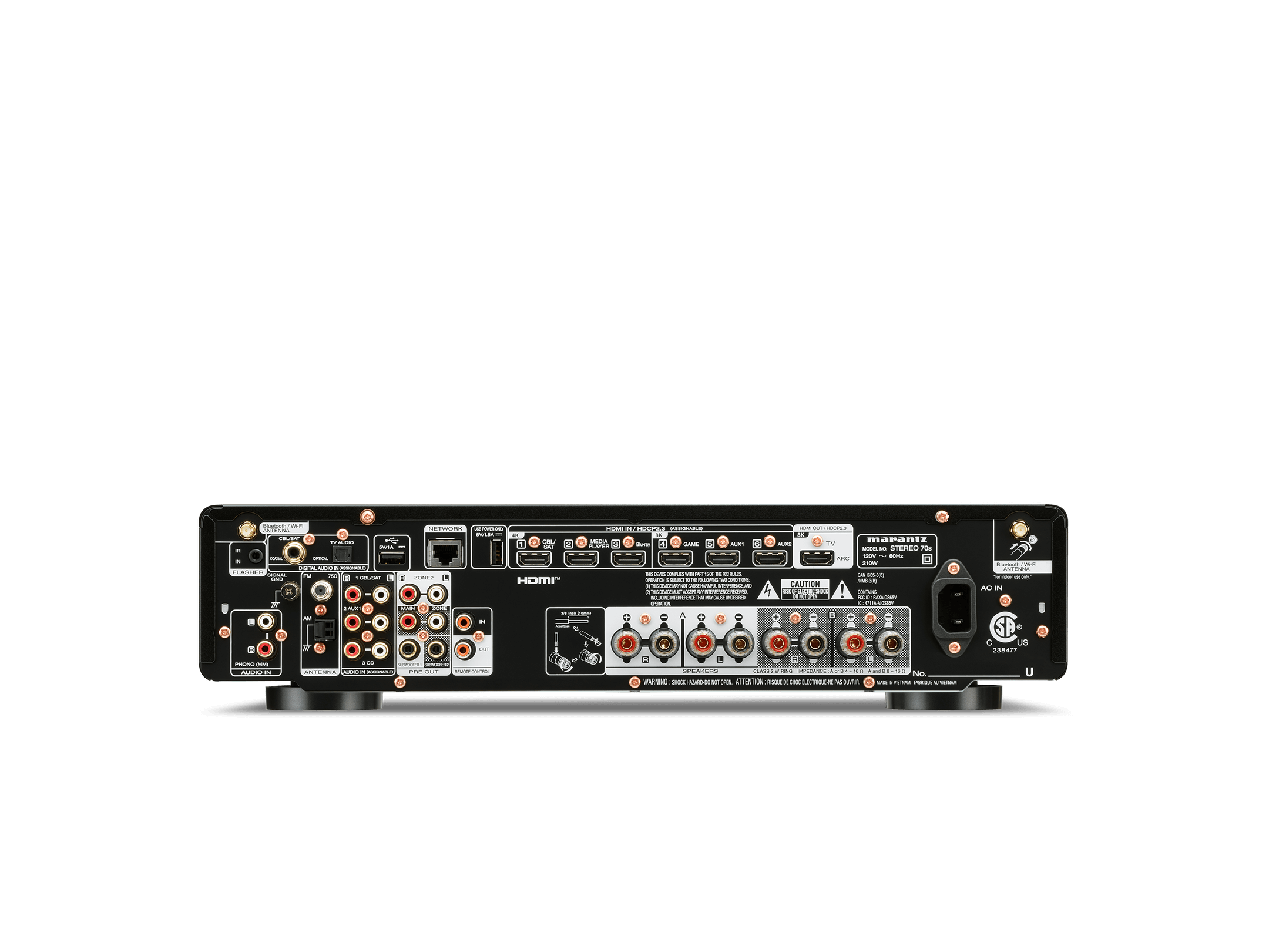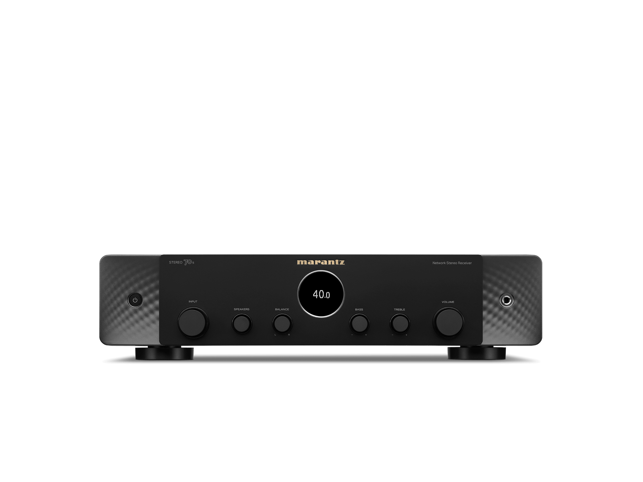 Marantz Stereo 70s Black — двухканальный AV-ресивер класса Hi-Fi, выполненный в тонком корпусе (Slimline Design) с алюминиевой фронтальной панелью, OLED-дисплеем и симметричным расположением органов управления. Архитектура построена по дискретной схеме усиления класса A/B с применением фирменных модулей HDAM (Hyper Dynamic Amplifier Module). Мощность 2 х 75 Вт (8 Ом, 20 Гц–20 кГц, 0,08%). Stereo 70s сочетает в себе функционал усилителя и гибкость AV-центра: устройство поддерживает передачу видео до 8K / 60 Гц, работу с HDR-форматами (HDR10+, Dolby Vision, HLG), автоматическое управление задержками (ALLM) и функции HDMI-ARC для вывода звука с телевизора. Встроенный модуль HEOS Built-in обеспечивает потоковое воспроизведение с популярных платформ — Spotify Connect, TIDAL, Amazon Music HD, Deezer и др., а также интеграцию в многозонные системы HEOS. Поддерживаются форматы FLAC 192 кГц / 24-бит, WAV, ALAC, DSD 2.8/5.6 МГц, а также управление голосом через Alexa, Google Assistant, Apple Siri и Josh AI. Модель имеет 6 HDMI-входов, аналоговые и цифровые входы, фонокорректор MM, двойной выход на сабвуфер и акустические терминалы A/B. В комплекте идет пульт дистанционного управления. В комплекте идет пульт дистанционного управления.