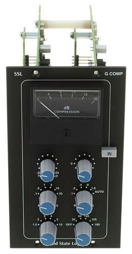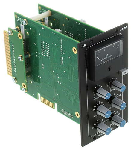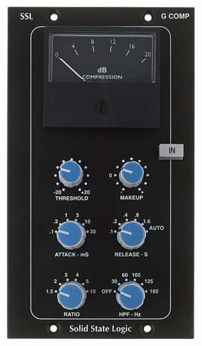 Solid State Logic 500-Series Bus Compressor MkII — стереофонический компрессор в формате API 500 Series. Модуль разработан для работы в стереопаре и занимает два слота 500-серии, обеспечивая классическую VCA-компрессию с характерным «клеящим» эффектом. Устройство предназначено для установки на мастер-шину, сабгруппы или стереогруппы и ориентировано на достижение плотности, панча и целостности микса без потери прозрачности и детализации. В основе схемотехники лежит аутентичная архитектура компрессора центральной секции аналоговых консолей SSL G-Series 1980-х годов. Именно этот дизайн сформировал представление о «bus compression» как о художественном инструменте, способном объединять элементы микса в единое целое. 500-Series Bus Compressor MkII сохраняет классический характер работы VCA-каскада, но дополнен современными доработками, включая встроенный High-Pass Filter в цепи сайдчейна, позволяющий контролировать реакцию компрессии на низкочастотный контент и избегать «пампинга» при насыщенном басе. Компрессор оснащён стандартным набором органов управления — Threshold, Attack, Release, Ratio и Make-Up Gain. Наличие нескольких значений коэффициента компрессии, фиксированных временных констант и автоматического режима релиза делает устройство универсальным инструментом как для аккуратного «склеивания» микса, так и для более агрессивной динамической обработки. Стерео-линк каналов реализован на аппаратном уровне, что гарантирует стабильную стереокартину.