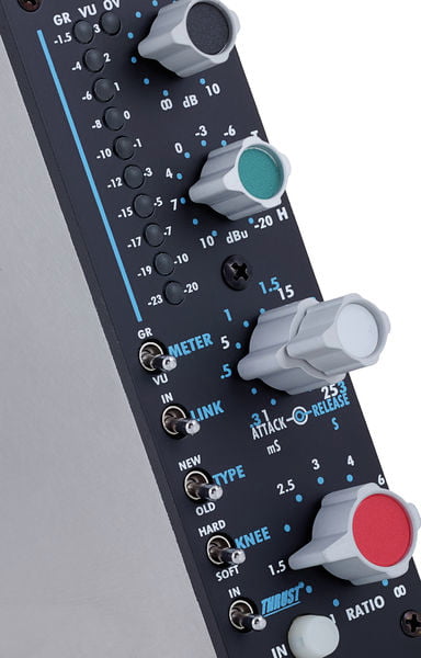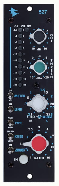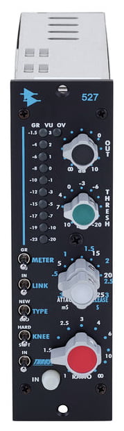 API Audio 527A — компрессор/лимитер формата 500 Series, разработанный как часть линейки VCA-компрессоров API. Модуль построен на дискретных операционных усилителях API 2510 и 2520 и сочетает классическую архитектуру с современными алгоритмами управления динамикой. API 527A поддерживает как feed-back, так и feed-forward методы компрессии, что позволяет выбирать между более винтажной, музыкальной реакцией и современной, точной VCA-компрессией. Переключаемый характер колена (soft/hard knee) расширяет диапазон применения: от мягкого, практически незаметного выравнивания динамики до агрессивного лимитирования. Запатентованная функция THRUST реализует частотно-зависимую обработку сайдчейна, сохраняя плотность и ударность низкочастотного диапазона даже при значительной компрессии. Все основные параметры — порог, атака, релиз, коэффициент компрессии и уровень выхода реализованы на 31-позиционных фиксированных регуляторах. Выходной каскад выполнен с трансформаторной балансной развязкой, а встроенный аппаратный байпас с реле гарантирует полное исключение схемы из тракта при необходимости. Возможность линковки нескольких модулей через DC-link делает API 527A пригодным для стерео- и многоканальных конфигураций.