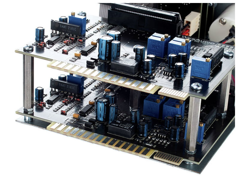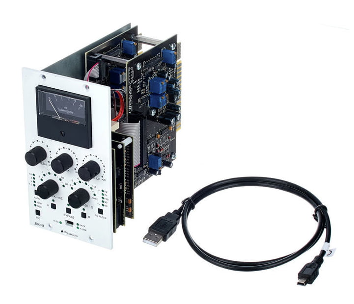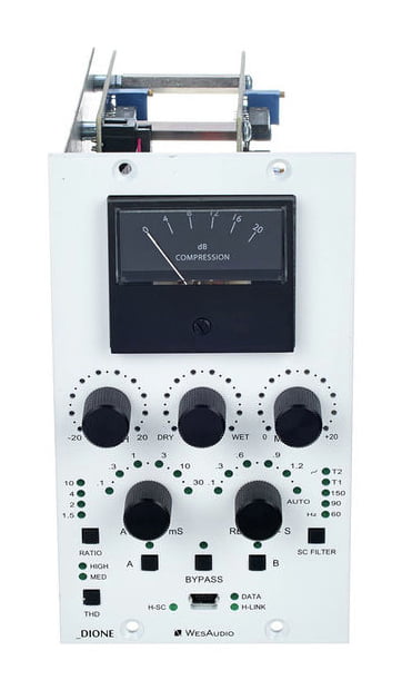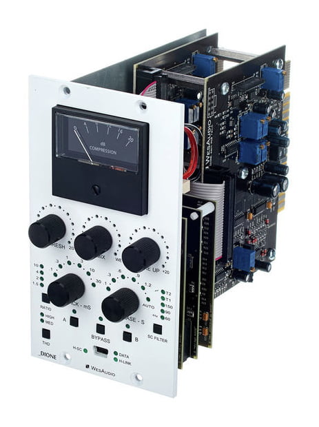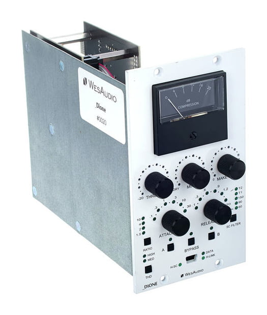 Wes Audio Dione — аналоговый VCA-компрессор формата 500 Series. Разработан как центральное звено для микширования и мастеринга, обеспечивает знаменитый «bus glue»-эффект. Несмотря на цифровое управление, звуковой тракт полностью аналоговый, основанный на VCA-модулях THAT 2181, два в основном тракте и два в детекторе сайдчейна, что обеспечивает линейность и низкий уровень шума. Несмотря на цифровое управление, сигнал проходит через полностью аналоговую цепь с запасом по уровню +24 dBu, что гарантирует отсутствие артефактов. Благодаря протоколу GCon устройство может быть полностью интегрировано с DAW через USB или Ethernet, что позволяет использовать функции Total Recall, цифровой автоматизации и управления параметрами прямо из плагина (VST2, VST3, AU, AAX, AAX DSP). Три энкодера позволяют записывать автоматизацию параметров Threshold, Mix и MakeUp непосредственно в цифровой аудиостанции. Dione совместим с системами ng500 (например, WesAudio _TITAN), что позволяет объединить несколько модулей в единую управляемую сеть. Функция Hardware A/B даёт возможность мгновенно сравнивать две конфигурации настроек, а True Bypass гарантирует прозрачный обход сигнальной цепи при необходимости. Особое внимание уделено тональной окраске: система THD (Total Harmonic Distortion) предлагает два режима — Medium и High, которые добавляют аналоговое гармоническое насыщение и подчеркивают глубину и плотность микса. Функция Mix позволяет реализовать параллельную компрессию. Время атаки и релиза охватывает широкий диапазон: атака регулируется от 0,1 до 30 мс, релиз — от 0,1 до 1,2 с, с дополнительным автоматическим режимом. Диапазон компрессии представлен четырьмя фиксированными коэффициентами: 1.5:1, 2:1, 4:1, 10:1. Секция сайдчейна оснащена набором фильтров: тремя ВЧ-фильтрами (60, 90 и 150 Гц) и двумя tilt-фильтрами с фирменной кривой, предотвращающими чрезмерное срабатывание компрессии от низких частот. Благодаря цифровому сайдчейну можно направлять любой аудиосигнал из DAW для внешнего управления компрессией.
