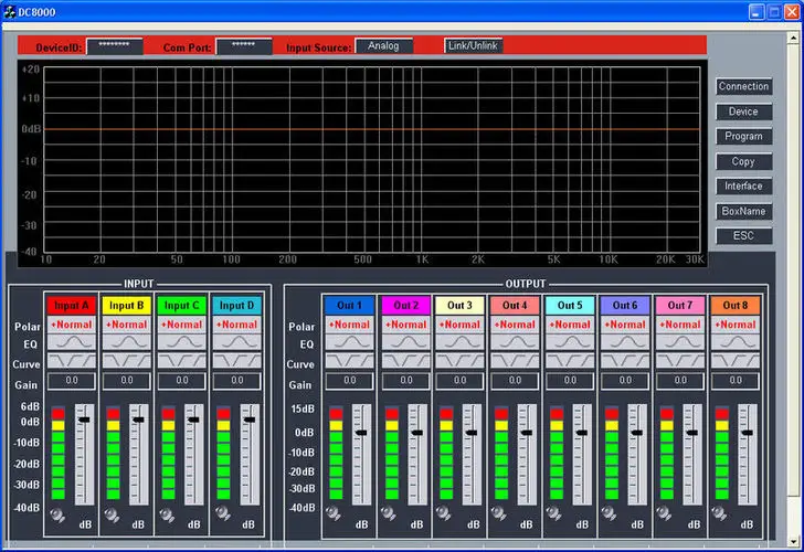 Есть предустановленные пресеты, можно делать и свои. Все установки отображаются на контрастном информативном дисплее. DSP 600 позволяет обрабатывать сигнал поканально параметрическими и графическими эквалайзерами, задержками по входу и выходу и лимитированием. Возможно подключение нескольких приборов для совместной работы в режиме Master/Slave через интерфейс RS 232. Программное обеспечение под ОС Windows, поставляемое вместе с процессором, позволяет управлять прибором через интерфейс USB, расположенный на передней панели.