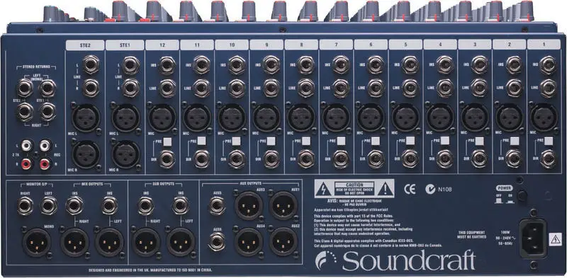 Все стерео-входы имеют два микрофонных и два линейных входа. Микрофонные входы имеют отдельные регуляторы gain для правого и левого входа, а также микрофонный усилитель как на моно-входе. Оба входа (микрофонный и линейный) могут использоваться одновременно. На стерео-каналах установлены четырехполосные эквалйзеры с фиксированными частотами и переключателем sum-to-mono.