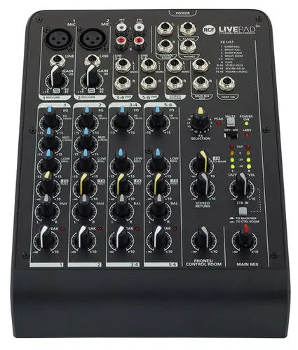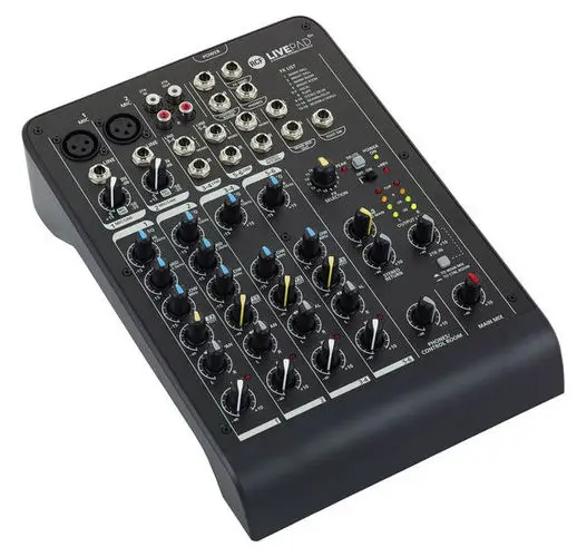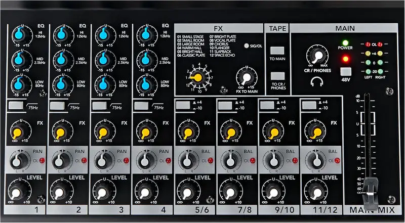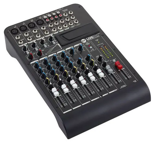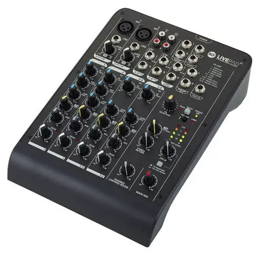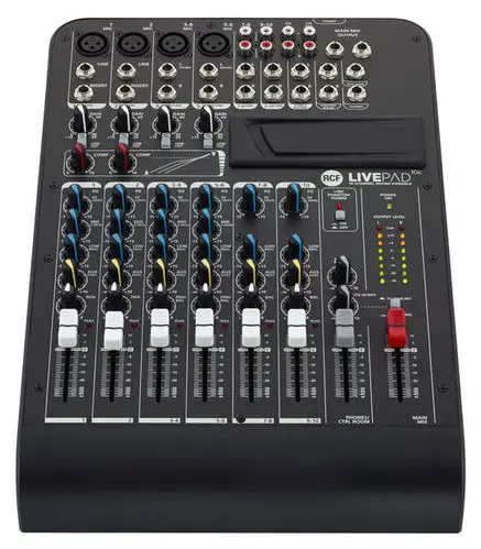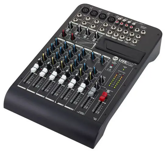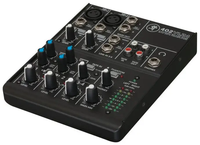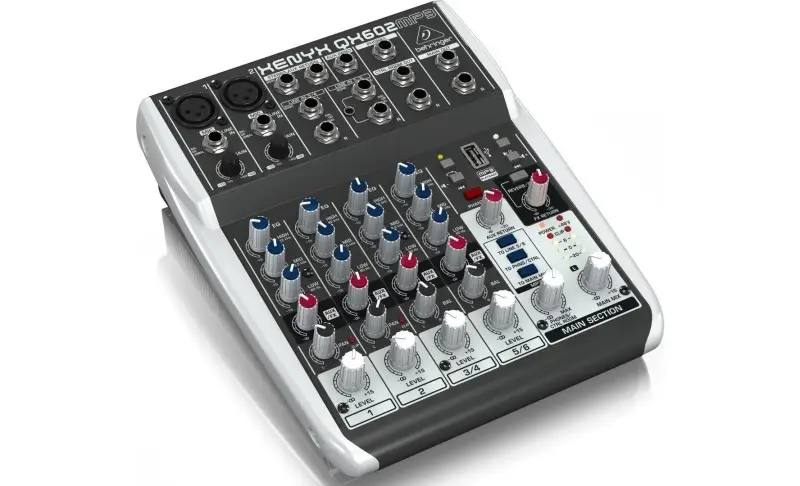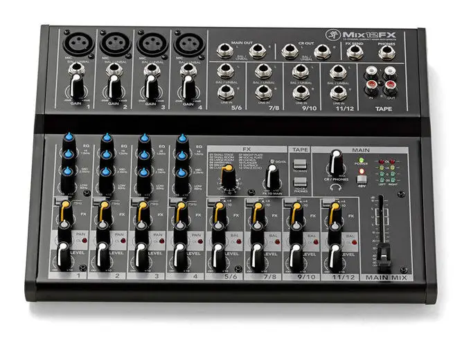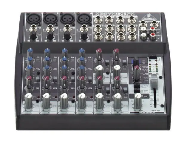 Малошумящий микшерный пульт MixPad MXP124. Имеется 4 микрофонных XLR и 4х2 RCA входа, 3х-полосный эквалайзер, встроенный компрессор и фейдеры 60мм. Девайс располагает фантомным питанием 48 вольт и выходом на наушники.