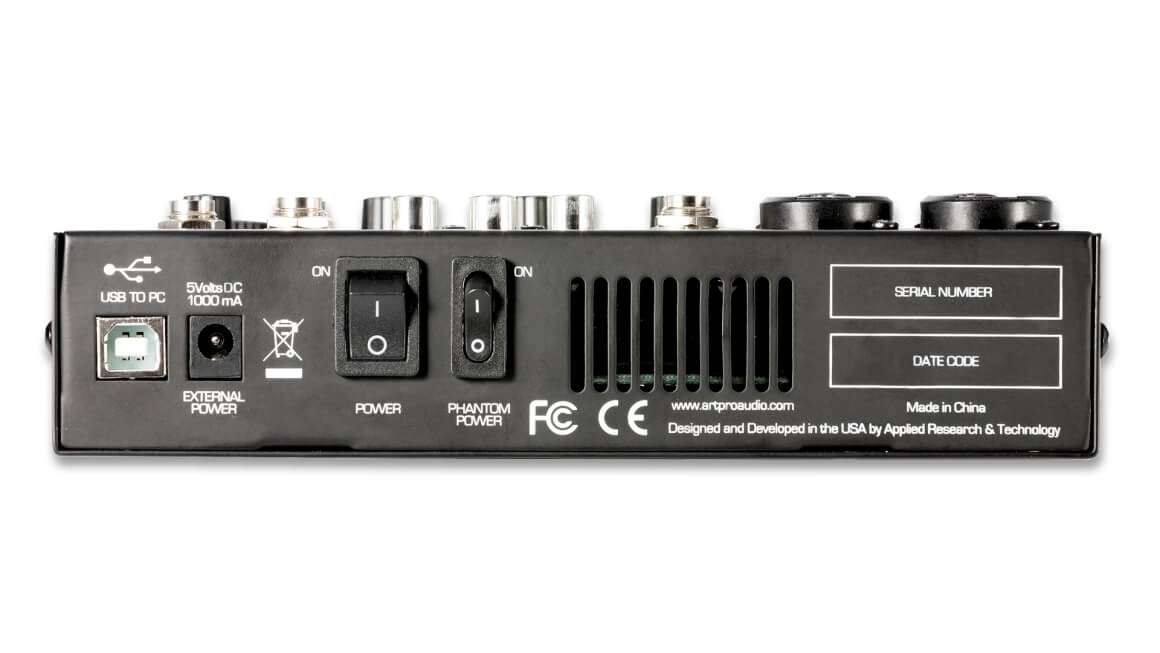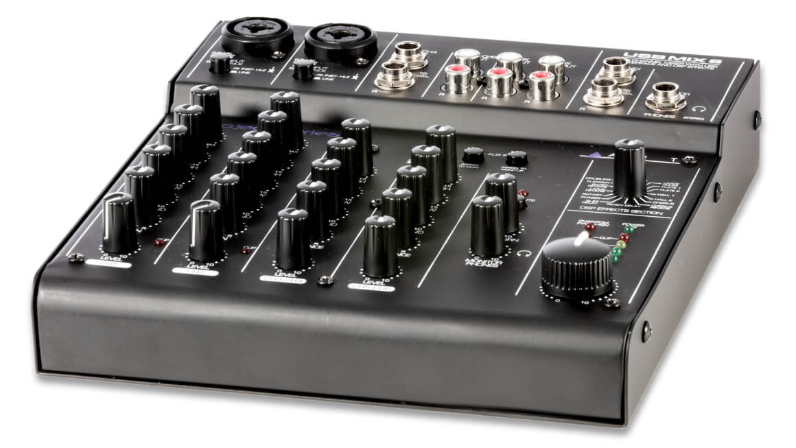 ART USB Mix 6 — компактный шестиканальный аналоговый микшерный пульт с цифровым аудиоинтерфейсом и встроенным блоком эффектов. Микшер включает шесть дискретных каналов: первые два оснащены комбинированными разъёмами XLR/TRS для подключения микрофонов, линейных источников и инструментов, а также имеют возможность подачи фантомного питания +48 В для конденсаторных микрофонов. Каналы 3–4 и 5–6 объединены в стереопары: первые работают через сбалансированные ¼″ TRS-входы, вторые — через небалансные RCA. Каждый канал оснащён двухполосным эквалайзером (ВЧ и НЧ) для тональной коррекции сигнала. Каналы 1–2 имеют отдельные регуляторы панорамы, тогда как для стереопар 3–4 и 5–6 используется регулятор баланса — он отвечает за соотношение левого и правого каналов внутри стереосигнала, не изменяя их положение в общей звуковой сцене. Встроенный процессор эффектов предоставляет 16 программ, включая реверберации, задержки и модуляции стерео. Каждый канал имеет независимый посыл на FX, а в мастер-секции расположены регуляторы возврата (FX Return), общий уровень и кнопка отключения эффектов (FX Mute). На передней панели предусмотрен светодиодный индикатор уровня, отдельные регуляторы громкости для основной шины и монитора/наушников, а также кнопка маршрутизации USB-потока: сигнал с компьютера может быть направлен на мониторный выход либо на стереоканал 5–6. Выходная секция включает балансные основные выходы (Main Mix), стереовыход TRS, мониторные TRS и RCA Loop Out. Интерфейс USB работает в режиме plug-and-play и совместим с macOS и Windows без установки драйверов. Передача сигнала осуществляется с разрядностью 16 бит при частоте дискретизации 44,1 или 48 кГц, при этом задержка аналого-цифрового преобразования составляет всего 0,4 мс (при 44,1 кГц). Питание может подаваться по USB или от внешнего адаптера 5 В / 500 мА. Уровень искажений низкий (<0,02%), запас по усилению высокий (до 54 дБ для микрофонных входов), отношение сигнал/шум выше 90 дБ.