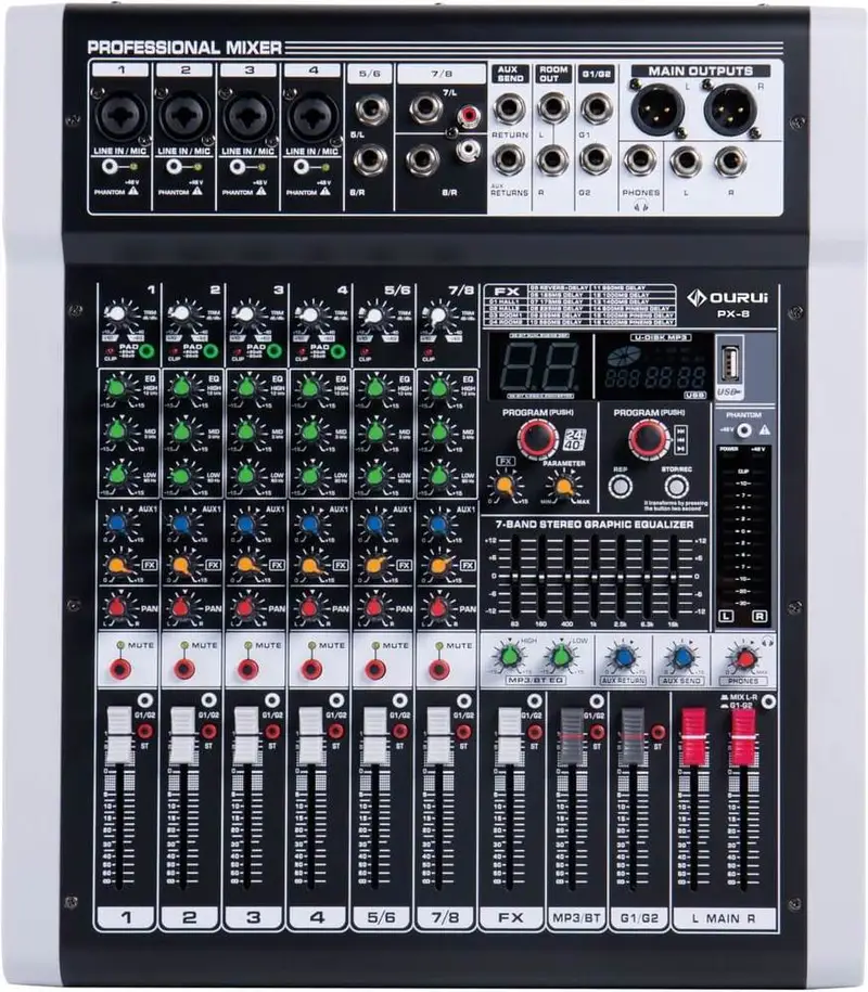 LAudio FK-04 — компактный 4-канальный аналоговый микшер из серии PRO, оснащённый двумя микрофонно-линейными входами (XLR/TRS) и двумя стерео входами Line, цифровым MP3-плеером с возможностью записи, подключением по Bluetooth и встроенным процессором эффектов. Каждый канал оборудован 3-полосным эквалайзером, регуляторами AUX, FX и PAN, а также фейдером громкости. Поддержка фантомного питания +48 В обеспечивает совместимость с конденсаторными микрофонами. В комплекте идет внешний адаптер питания.