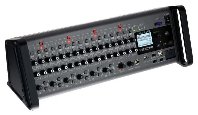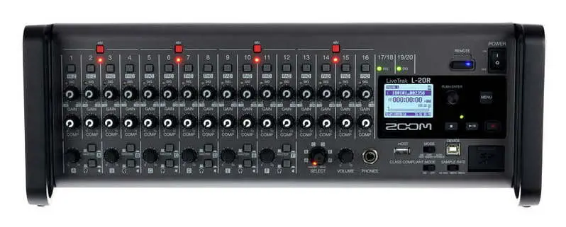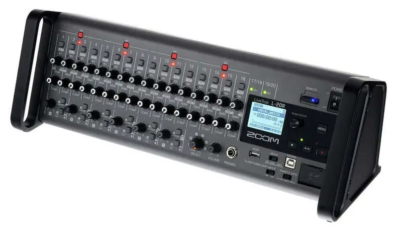 Zoom LiveTrak L-20 — цифровой микшер и многодорожечный рекордер. Оснащен 20 дискретными каналами: 16 моно (микрофон/линия) и 2 стерео, каждый с разъемами XLR или 1/4 дюйма. Устройство позволяет одновременно записывать до 22 дорожек с качеством до 24 бит/96 кГц на SD-карту и воспроизводить до 20 дорожек. Встроенный USB-аудиоинтерфейс 22 входа/4 выхода обеспечивает интеграцию с компьютерами и совместимость с iOS-устройствами. Шесть независимых выходов для наушников с индивидуальными миксами позволяют каждому участнику группы настраивать свой мониторинг. Также доступны функции фантомного питания +48 В, Hi-Z входов на каналах 1–2 и встроенной компрессии на каналах 1–16.
