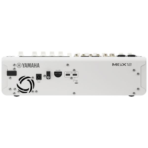 Yamaha MGX12 WH — компактный цифровой микшерный пульт. Сочетает в себе сенсорный интерфейс, встроенный DSP-процессор и USB-аудиоинтерфейс, формируя автономный центр управления звуком для сценических и студийных задач. Архитектура MGX12 построена вокруг 12 входных каналов, включая микрофонные и линейные источники, с развитой системой шин и маршрутизации, характерной для цифровых консолей. Центральным элементом управления является 4,3-дюймовый сенсорный дисплей с поддержкой навигации по параметрам каналов, эффектов, сцен и функций автоматизации, дополненный физическими фейдерами и назначаемыми кнопками. Встроенный DSP обеспечивает обработку сигнала и мониторинг без задержек, включая динамическую и пространственную обработку, а функции Auto Gain, Clip Safe и Scene Recall автоматизируют настройку уровней и позволяют мгновенно переключаться между различными рабочими конфигурациями. Наличие USB-аудиоинтерфейса и слота microSD делает MGX12 пригодным как для интеграции с DAW, так и для автономной многодорожечной записи без компьютера, а Bluetooth-модуль расширяет сценарии подключения внешних цифровых источников звука.
