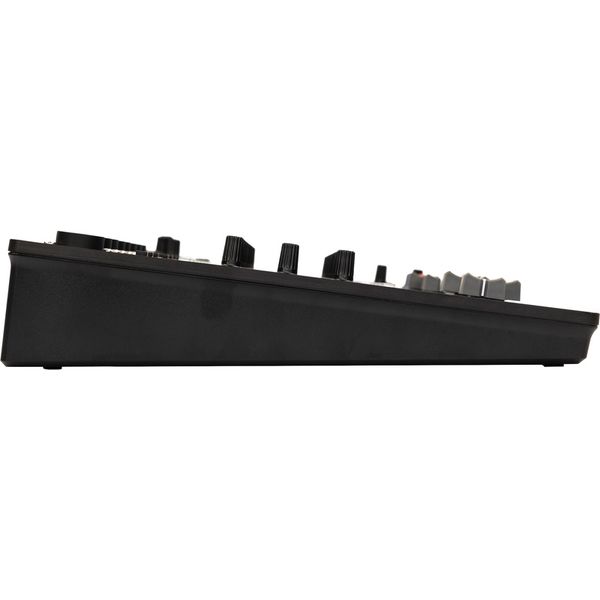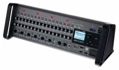 Zoom LiveTrak L-12 — цифровой микшер и многоканальный рекордер для живых выступлений, студийной работы, подкастинга и стриминга. Модель оснащена 12 каналами (8 моно и 2 стерео) и позволяет одновременно микшировать и записывать до 12 отдельных дорожек плюс мастер в стерео. Каналы 1–8 оборудованы комбинированными входами XLR/TRS с переключаемым фантомным питанием +48 В, при этом каналы 1 и 2 поддерживают режим Hi-Z для подключения гитар и бас-гитар. Каналы 9–12 предназначены для линейных сигналов (разъёмы 6,3 мм). Микрофонные предусилители обеспечивают усиление до +70 дБ и низкий уровень собственного шума (EIN −128 dBu). Каждый канал оснащён 60-мм фейдером со светодиодной индикацией уровня и тремя энкодерами с LED-кольцами для управления эквалайзером (ВЧ/СЧ/НЧ), усилением, панорамой, посылами Aux и компрессором. Предусмотрены компенсация задержки АЦП и OLED-дисплей для удобного контроля параметров. LiveTrak L-12 предлагает пять независимых мониторных миксов с индивидуально регулируемыми выходами на наушники, что позволяет каждому участнику записи настроить собственный баланс. Встроенный усилитель для наушников обеспечивает достаточный уровень громкости для сценической работы без отдельной системы мониторинга. В распоряжении пользователя — четыре стереовыхода Monitor (6,3 мм), стереовыход на наушники (6,3 мм) с регулятором громкости, стерео мастер-выход (2 х XLR), встроенный микрофон Talkback и память сцен для сохранения до 10 пользовательских миксов. Модель оснащена 16 встроенными эффектами с возвратом и мастер-каналом. Для управления функциями Punch In/Out и отключением эффектов предусмотрен вход для футсвитча (6,3 мм). Поддерживается беспроводное управление через iPad-приложение при использовании опционального Bluetooth-адаптера Zoom BTA-1. Устройство работает как USB-аудиоинтерфейс 14 входов / 4 выхода и поддержкой Class Compliant для Mac, Windows и iOS (для iOS требуется Apple Lightning to USB Camera Adapter). Доступна гибкая маршрутизация сигналов, интеграция для стриминга подкастов и прямых трансляций, а также несколько режимов работы: аудиоинтерфейс, USB-хост для переноса проектов на флеш-накопитель и режим кард-ридера.