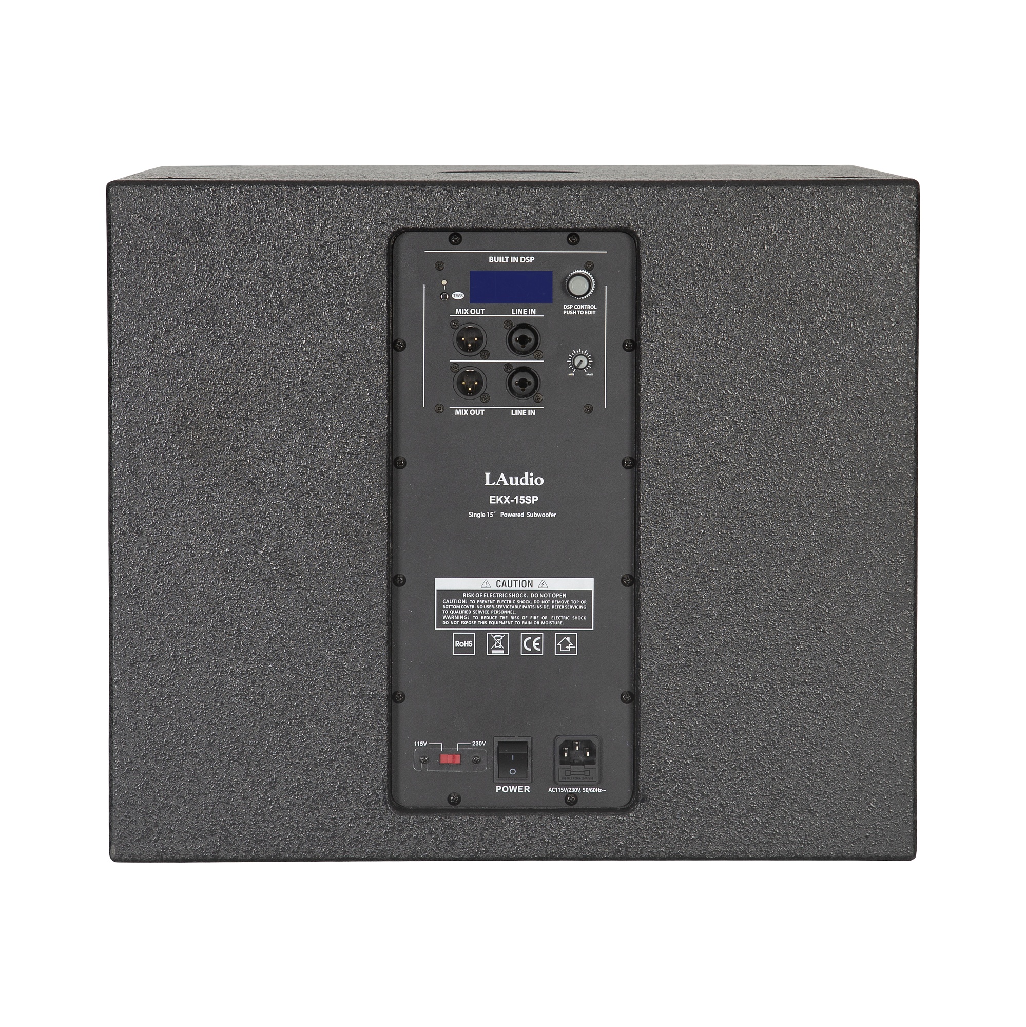 LAudio EKX15SP — активный 15-дюймовый сабвуфер мощностью 1300 Вт. Модель построена на базе высокочувствительного 15" динамика и усилителя класса D, обеспечивающего пиковый уровень звукового давления до 133 дБ. Встроенный процессор QuickSmartDSP реализует цифровую обработку сигнала с управлением через ЖК-дисплей и энкодер. Конструкция корпуса выполнена из 15-мм фанеры, оснащена большими щелевыми портами для минимизации искажений и формирования глубокого баса, металлическим прутком для усиления и защиты решётки и монтажной пластиной с резьбой M20.